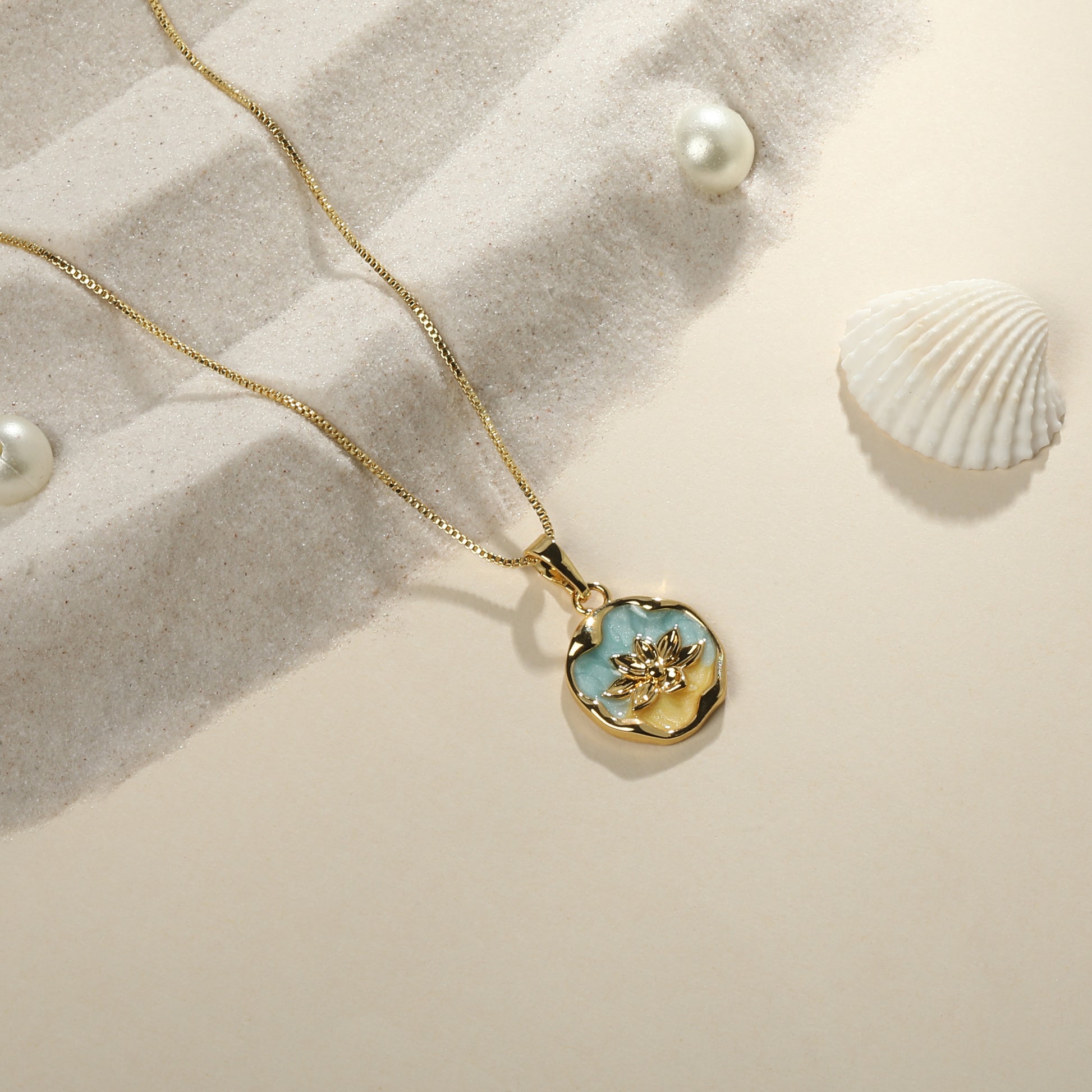 This charming gold-plated necklace features a round pendant with a rich blue enamel base, gently brushed with gold accents and a tiny flower at its center. The flower is framed by delicate patterns that catch the light, creating a look that’s both elegant and serene.