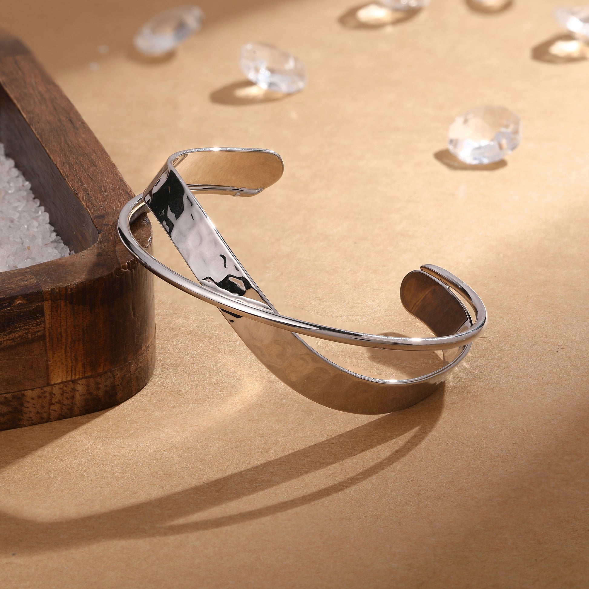 This wraparound cuff stands out with stacked textures and a metallic silver sheen that brings boldness in the most wearable way. Whether teamed with a black tee and sneakers or a structured dress, it adds instant cool.