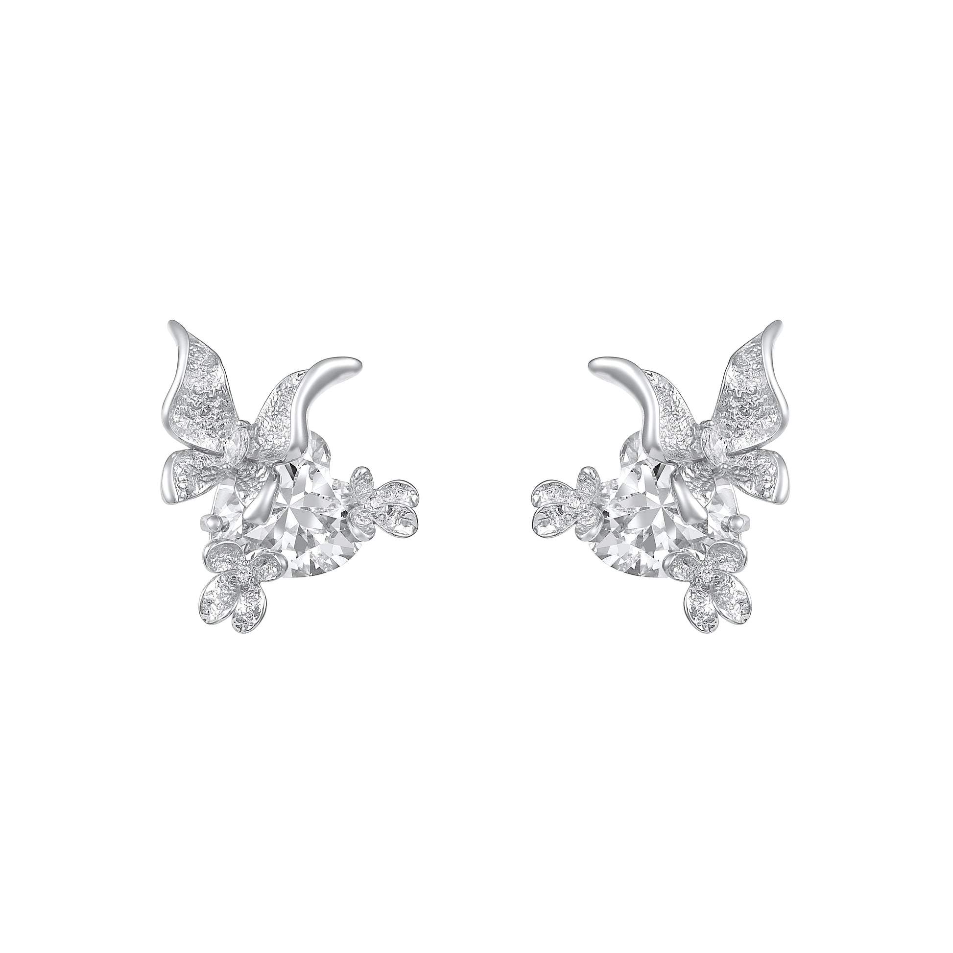 These graceful studs blend nature’s poetry with a touch of whimsy—featuring silver-toned leaves and a delicate butterfly perched beside a radiant cluster of clear stones. The composition evokes a moment of stillness in a blooming garden, where sparkle meets serenity.