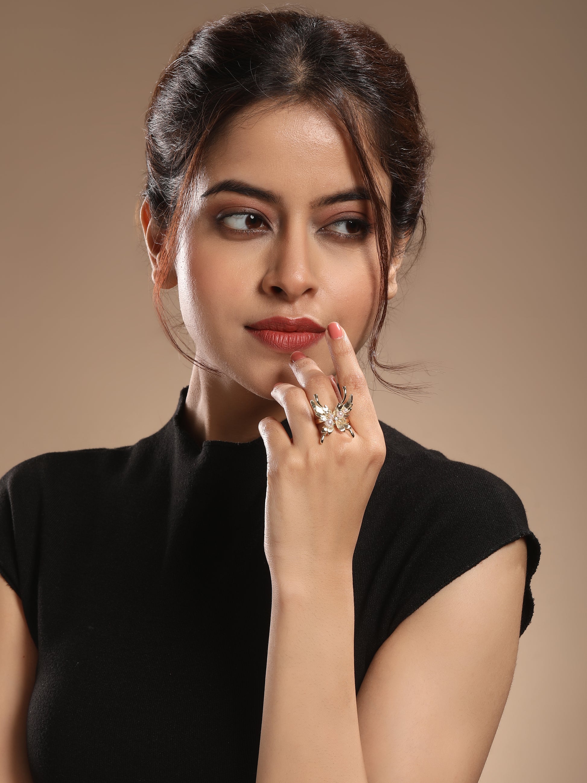 This butterfly-shaped ring brings a lovely mix of shine and softness with its 18KT gold-plated wings, tiny pearls, and a gentle touch of American diamond sparkle. The design feels light and graceful, perfect for adding a playful yet elegant touch to your jewelry collection.