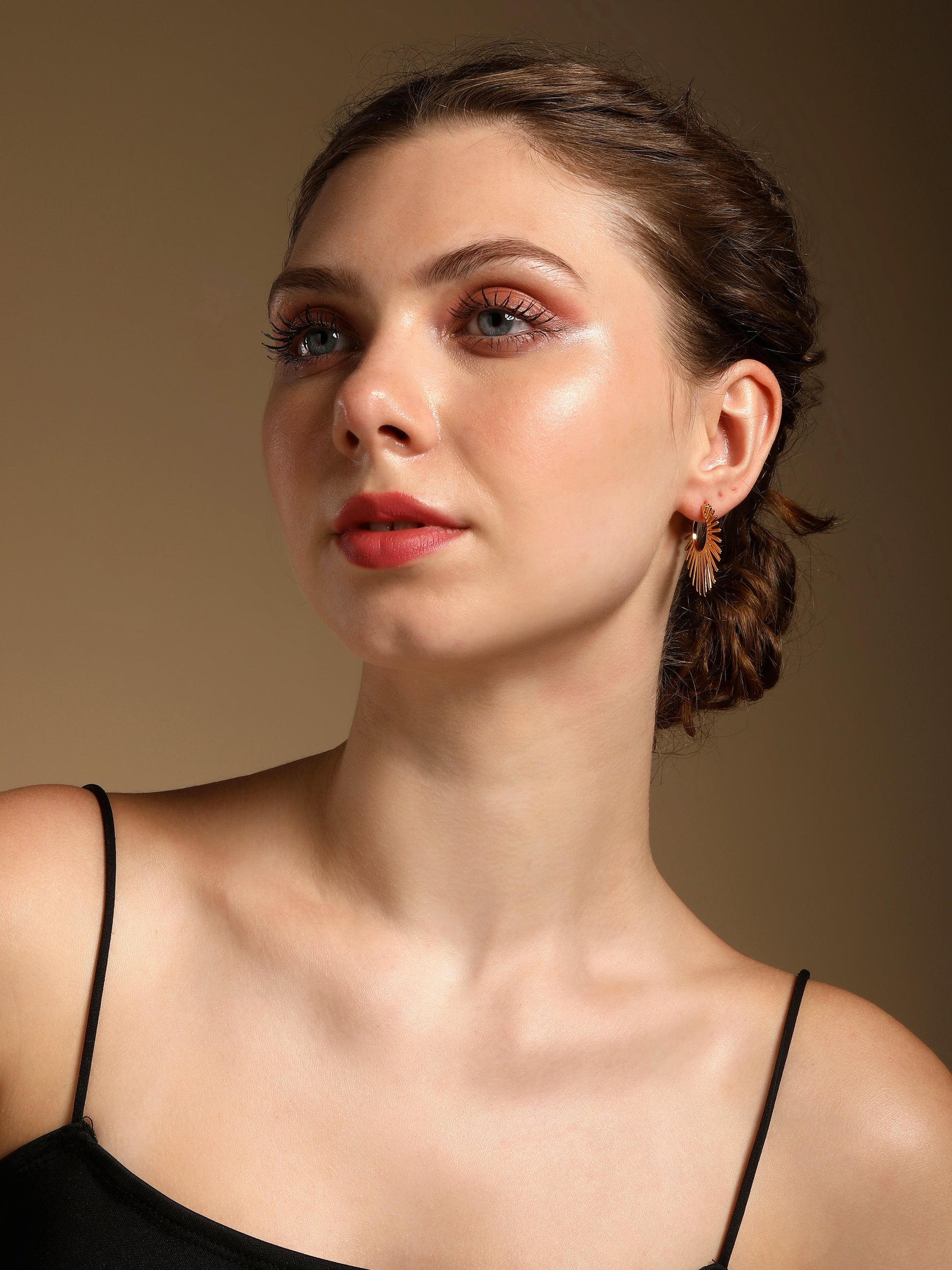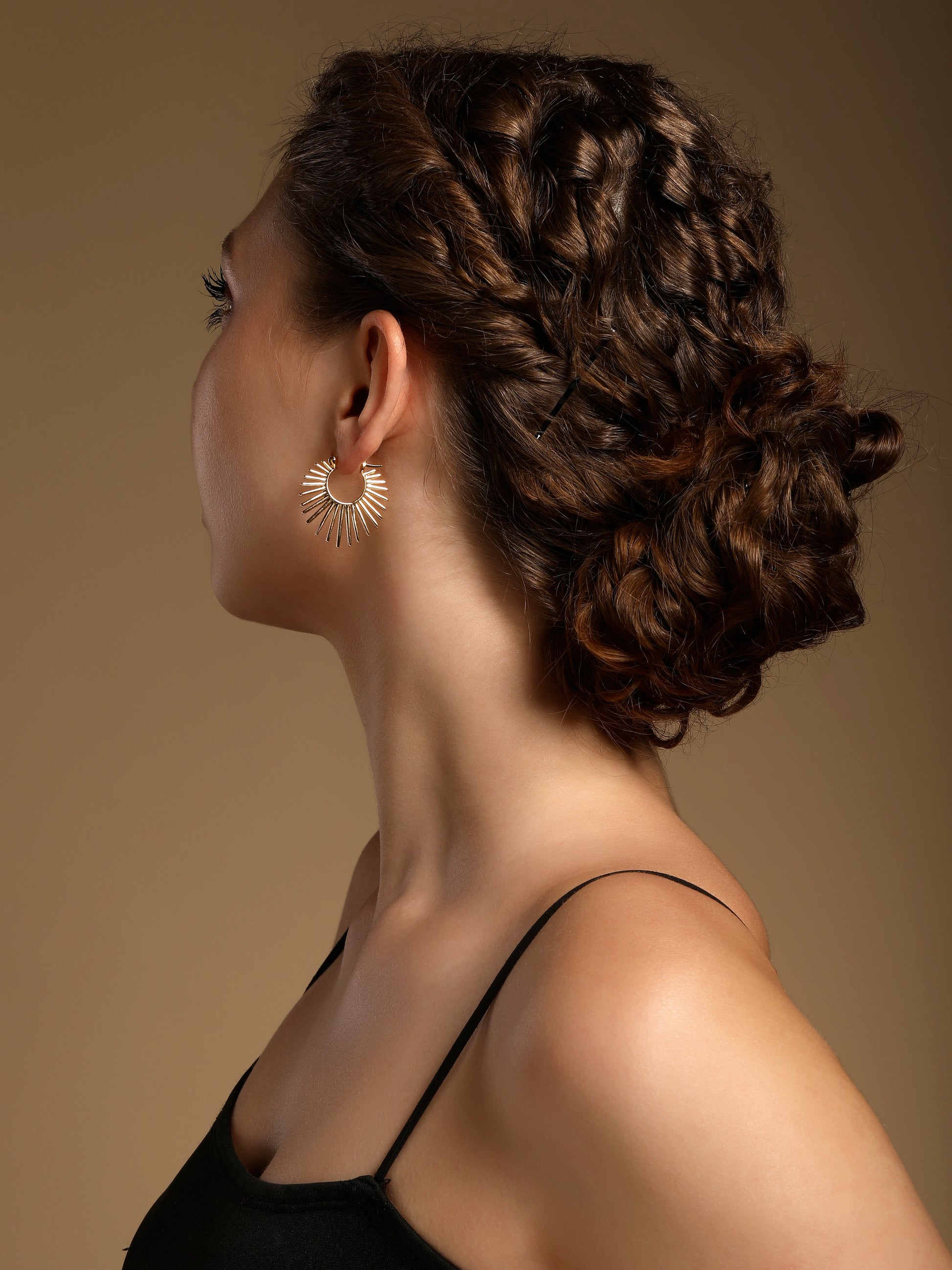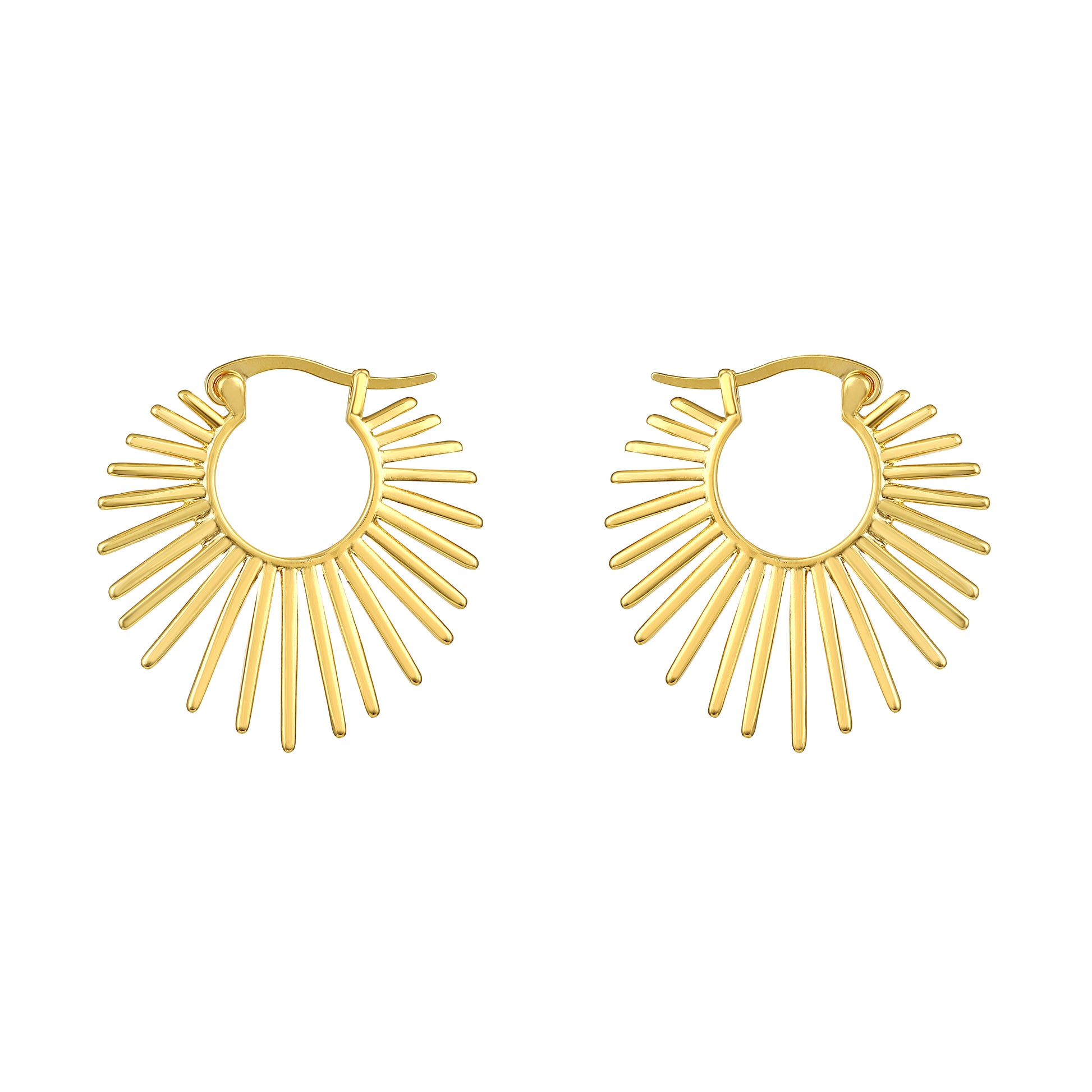 These unique hoop earrings feature a radiant sunburst design with tapered rays extending outward from a circular gold base. The sculptural design and high-shine 18KT gold plating bring warmth, energy, and bold elegance to this luminous accessory.