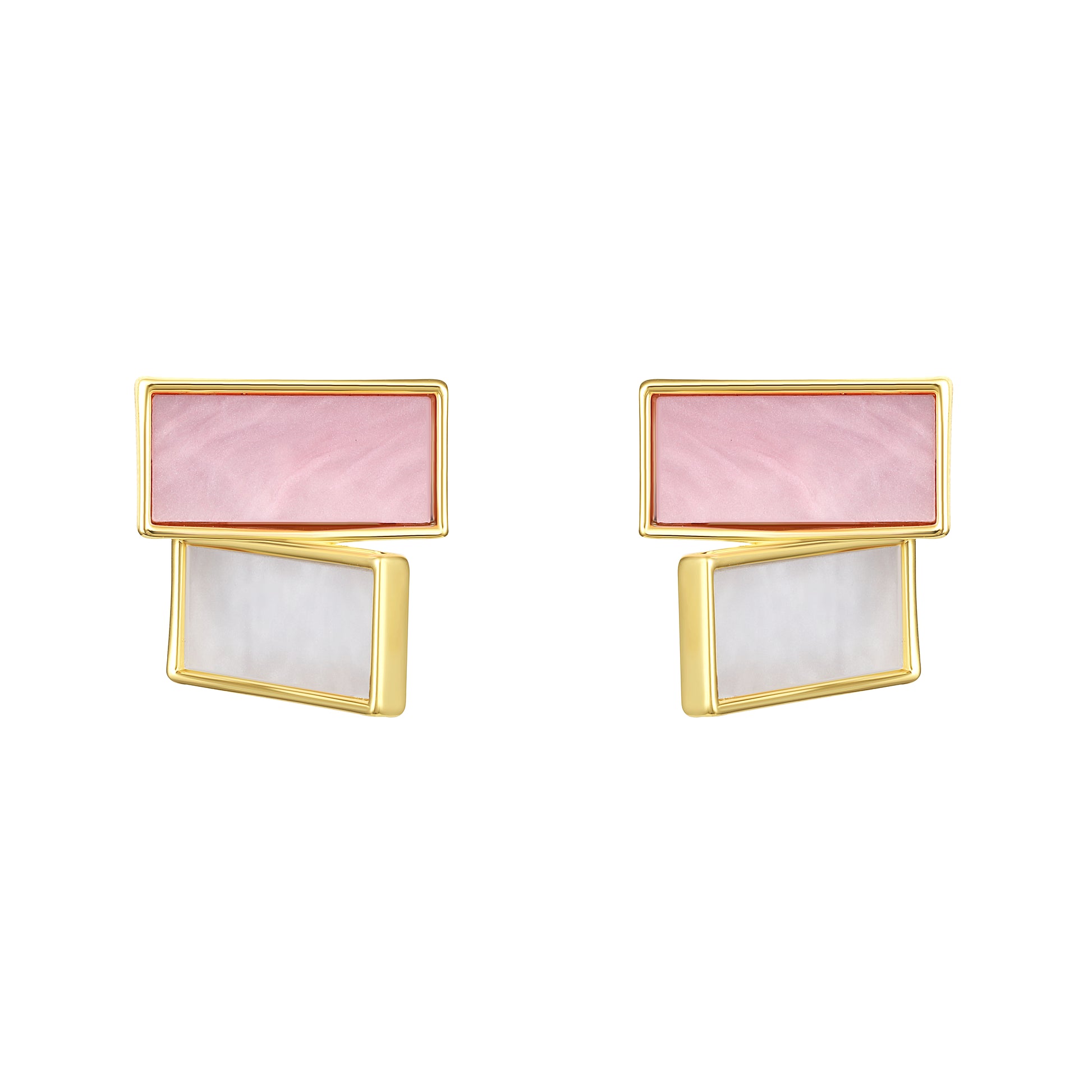 With a refined geometric profile, these drop earrings feature a stacked pair of rectangular gemstones—one blush-toned and the other opalescent—set in sleek gold frames. Their soft color contrast and clean lines offer a modern take on elegance that’s both youthful and chic.