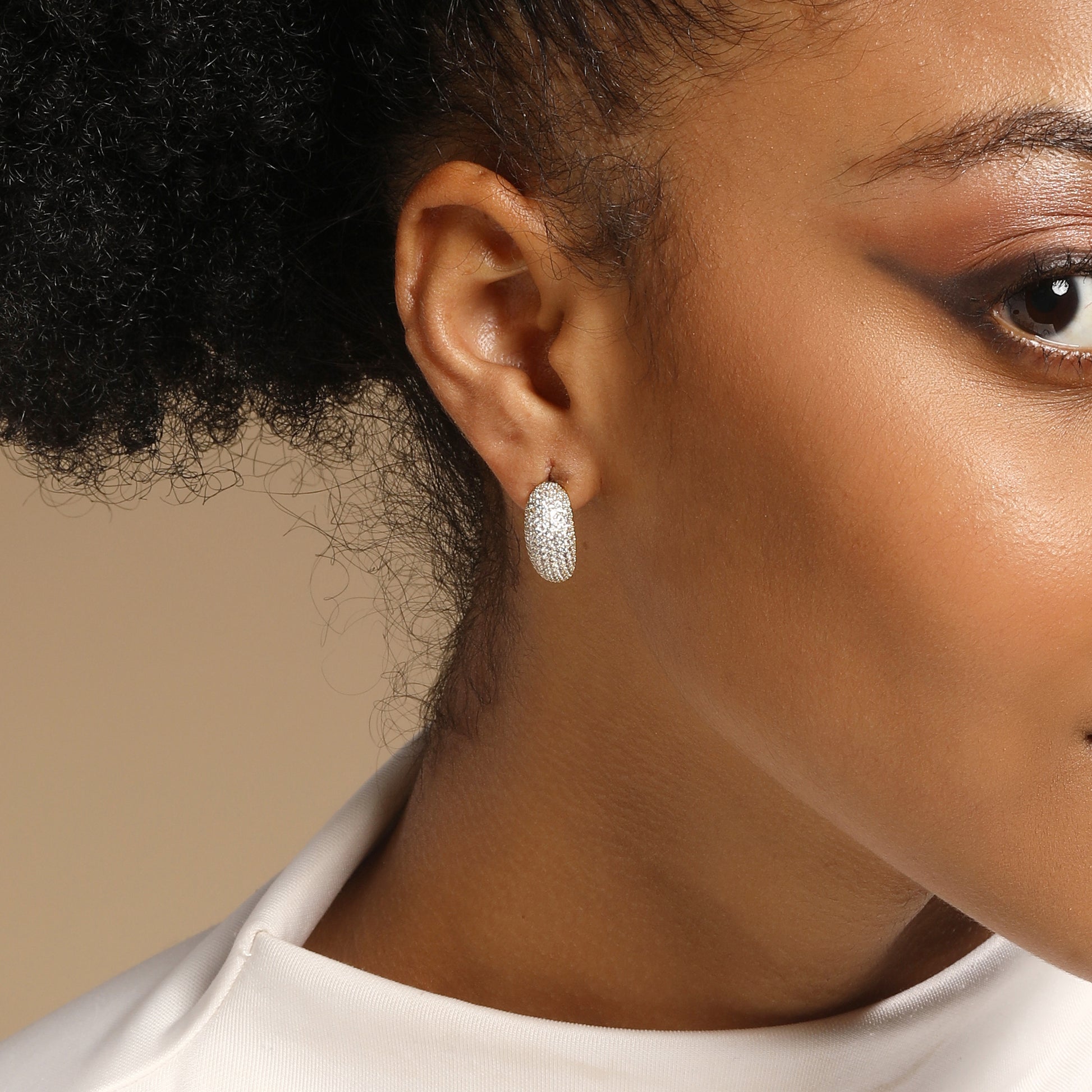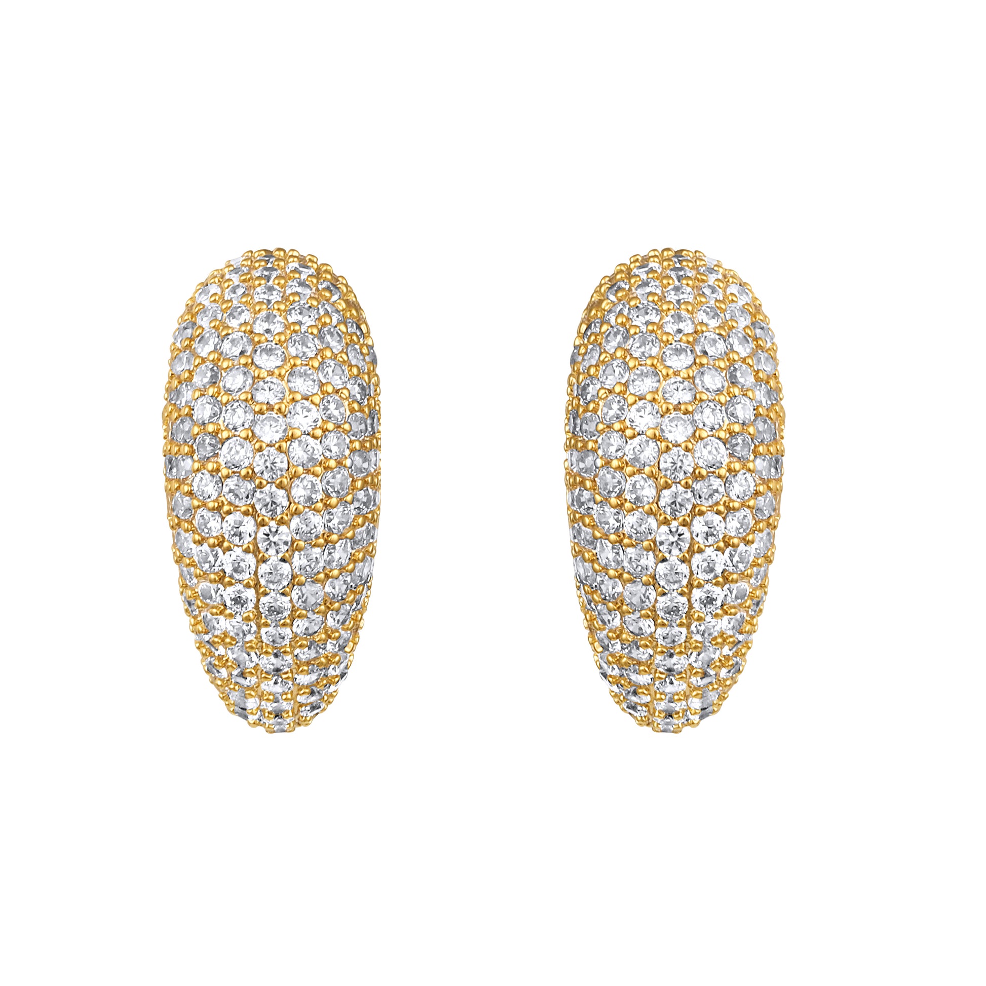 Sculpted in a graceful crescent, these gold-toned hoops shimmer with rows of delicate pave-set crystals that catch the light from every angle. Their smooth arc and refined sparkle bring a radiant elegance that feels both bold and timeless.