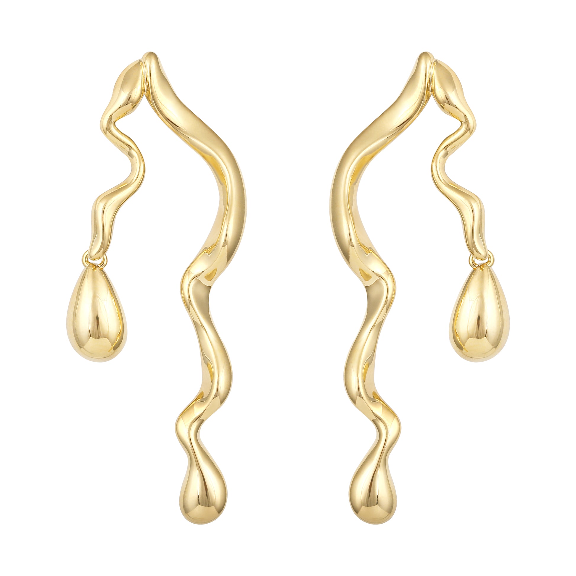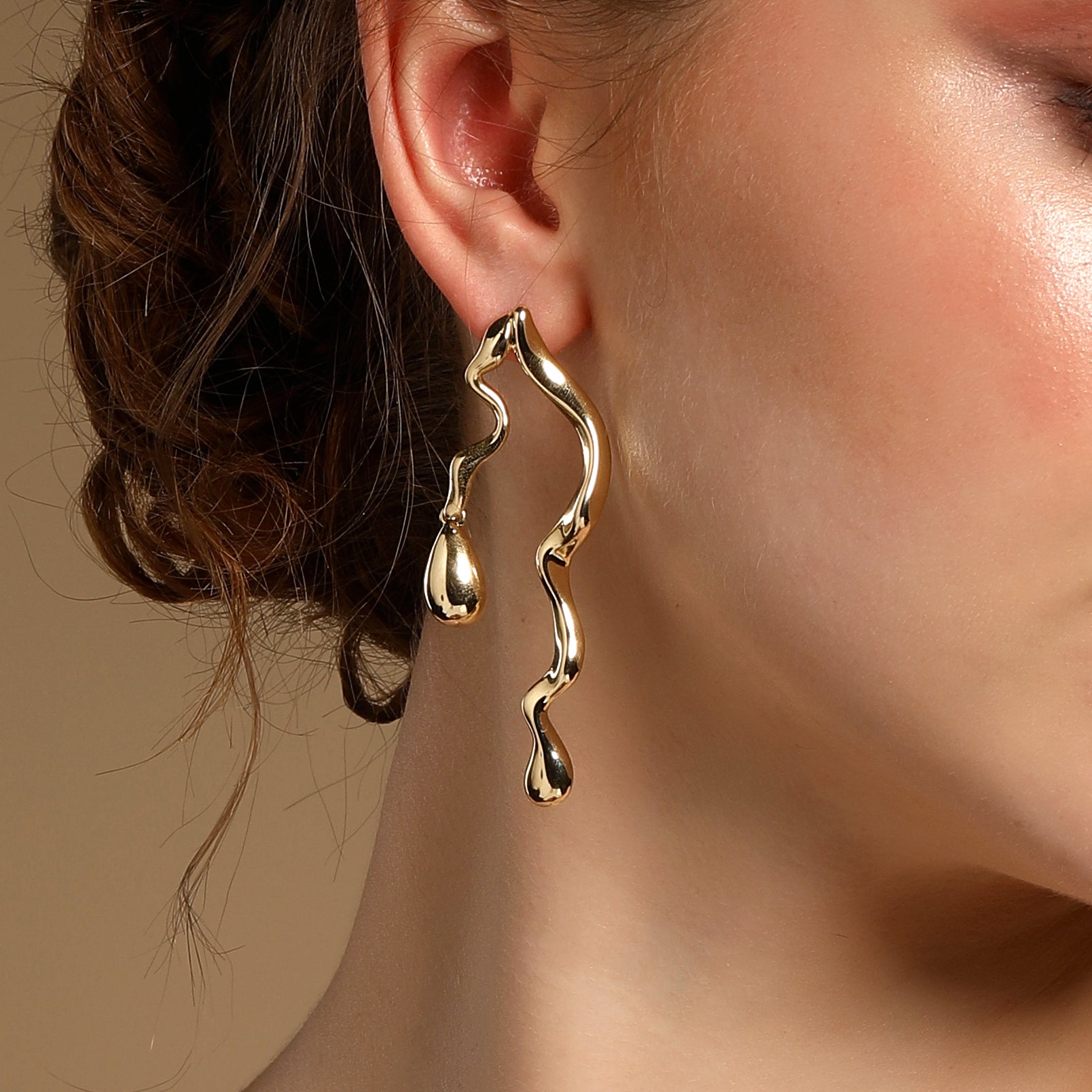 These sculptural earrings feature a unique wavy silhouette that flows into a soft teardrop shape, creating a dynamic yet graceful form. With their mirror-like symmetry and fluid lines, they offer a bold, artful vibe that's both eye-catching and versatile.