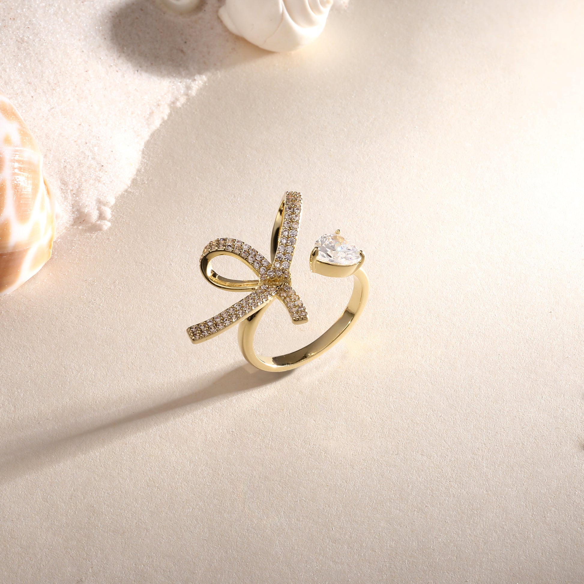 Delicate Bow-Knot Design 18kt Gold Plated Adjustable Zircon Finger Ring
