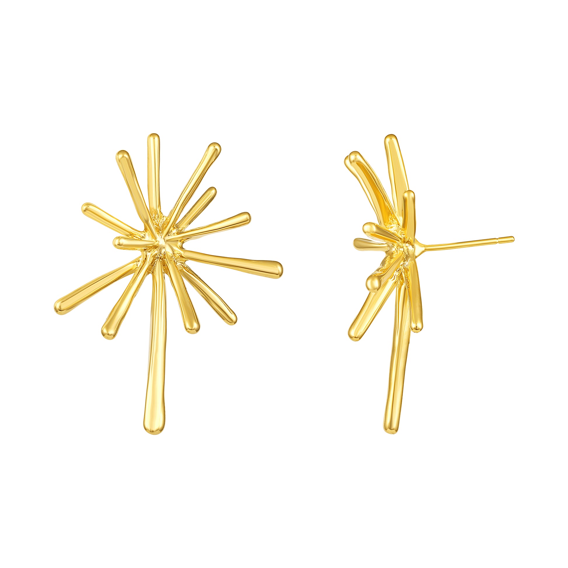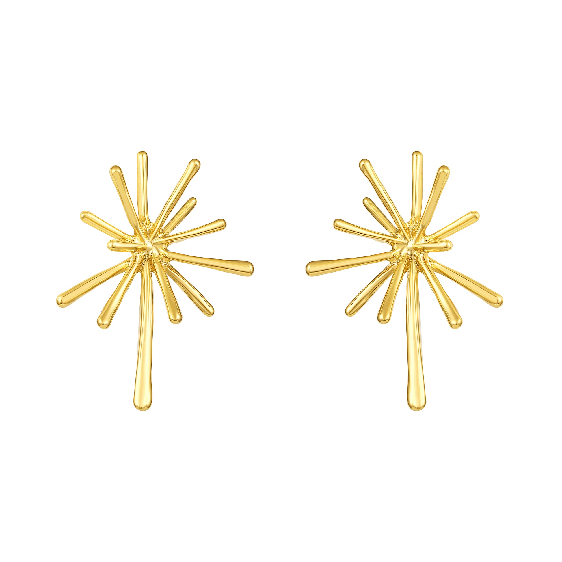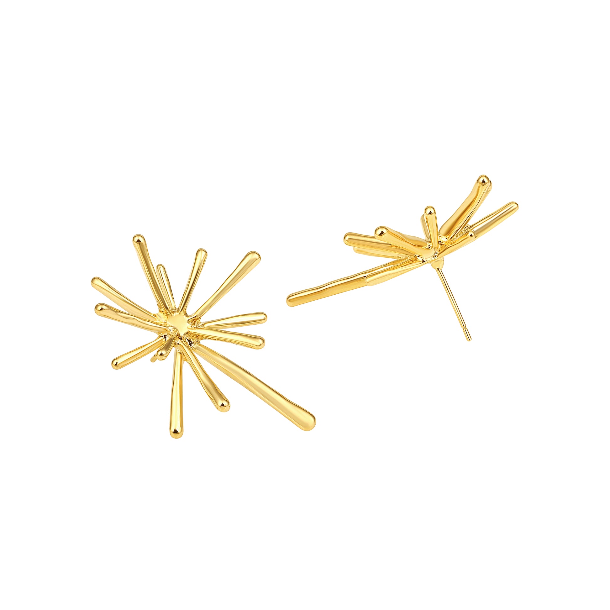 Designed to shine from every angle, these striking earrings feature a radiant starburst design made from elongated gold rods that flare outward in a dramatic, eye-catching pattern. The dimensional structure and polished finish create a sculptural glow that turns heads instantly.