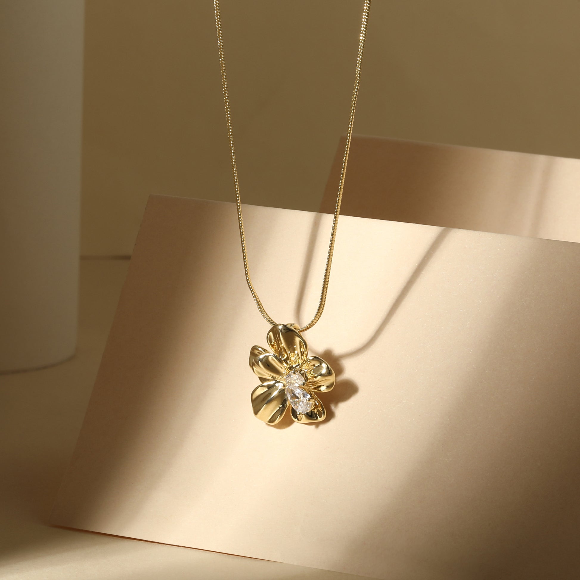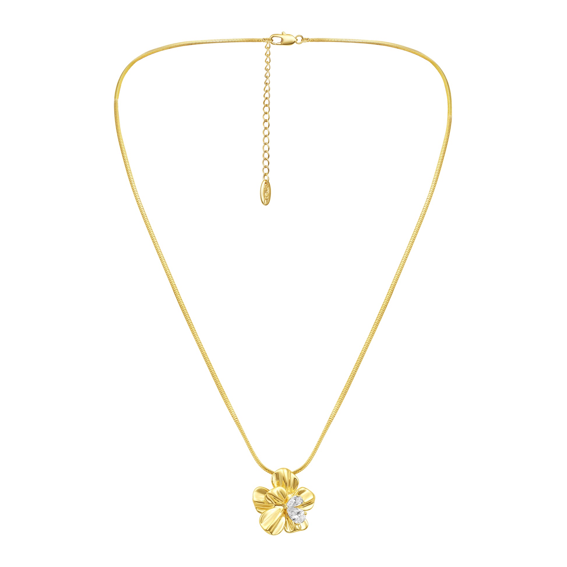 This delicate pendant features a blooming floral motif, crafted in 18KT gold plating with soft curves and petal-like detailing. Flowers in jewelry symbolize beauty, growth, and feminine energy—making this piece a timeless expression of grace.