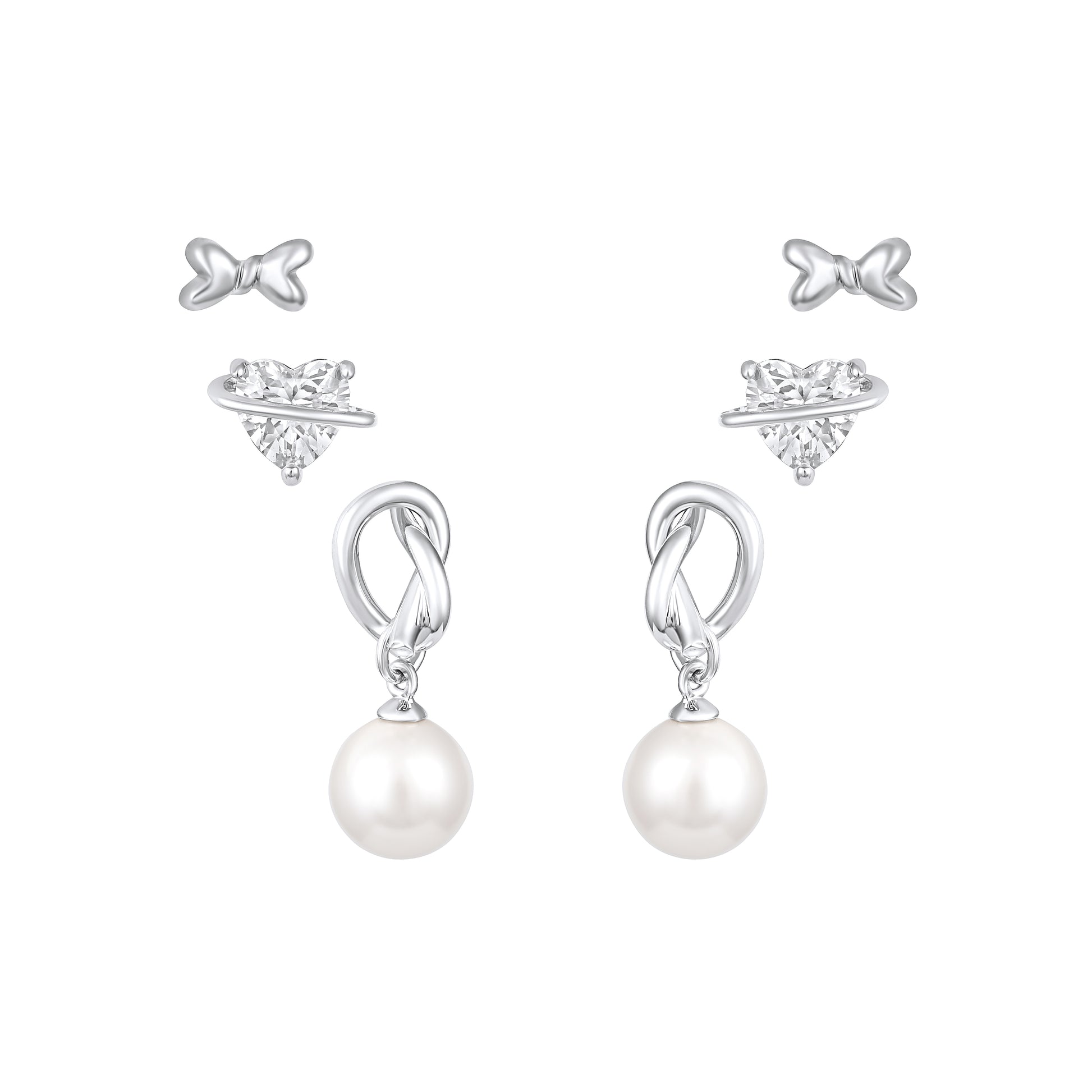 This charming set includes four thoughtfully styled earring pairs—sleek silver bows, petite triangle studs with bar accents, and a standout pearl-drop design with a twisted silver loop. Together, they offer a graceful mix of playfulness, polish, and occasion-ready elegance.