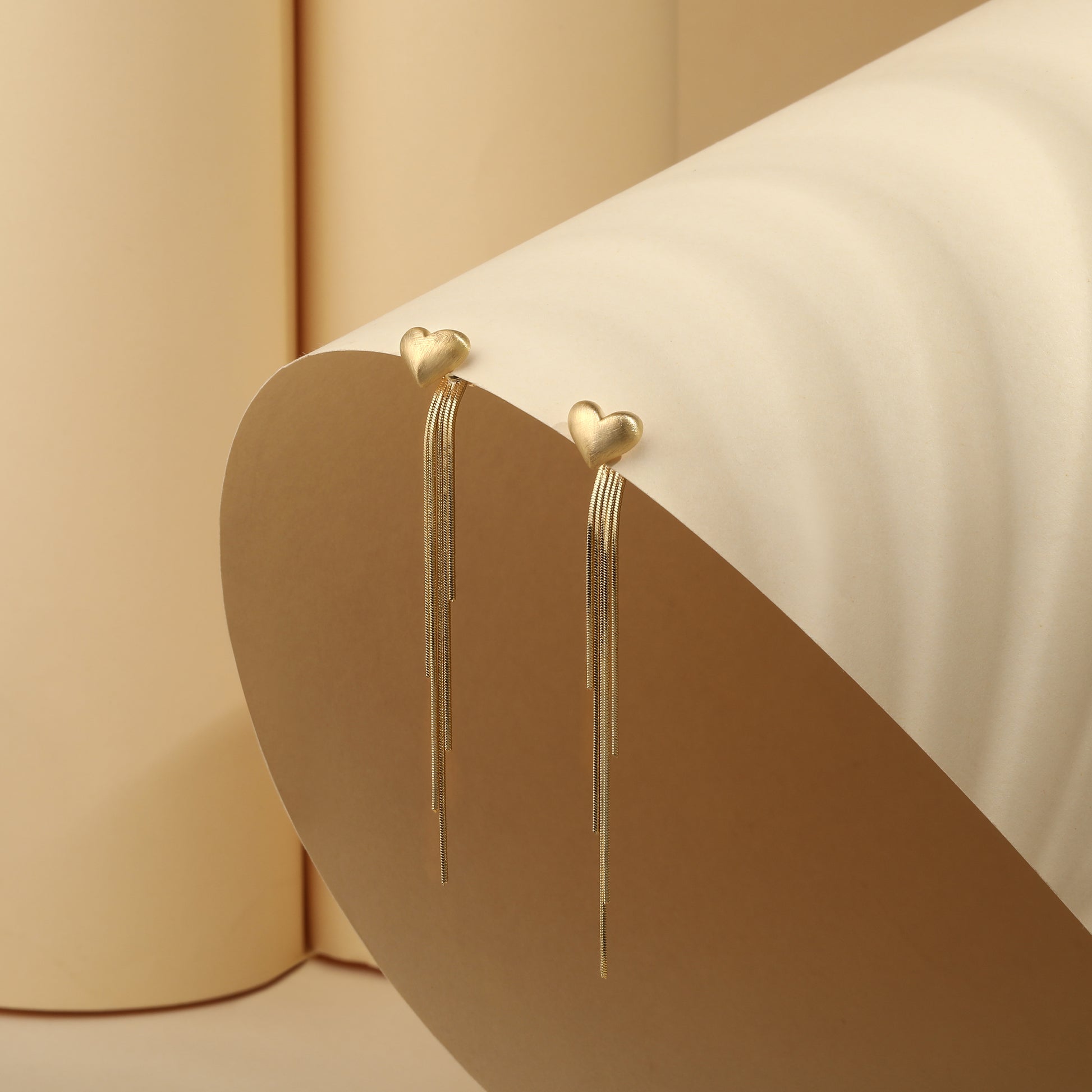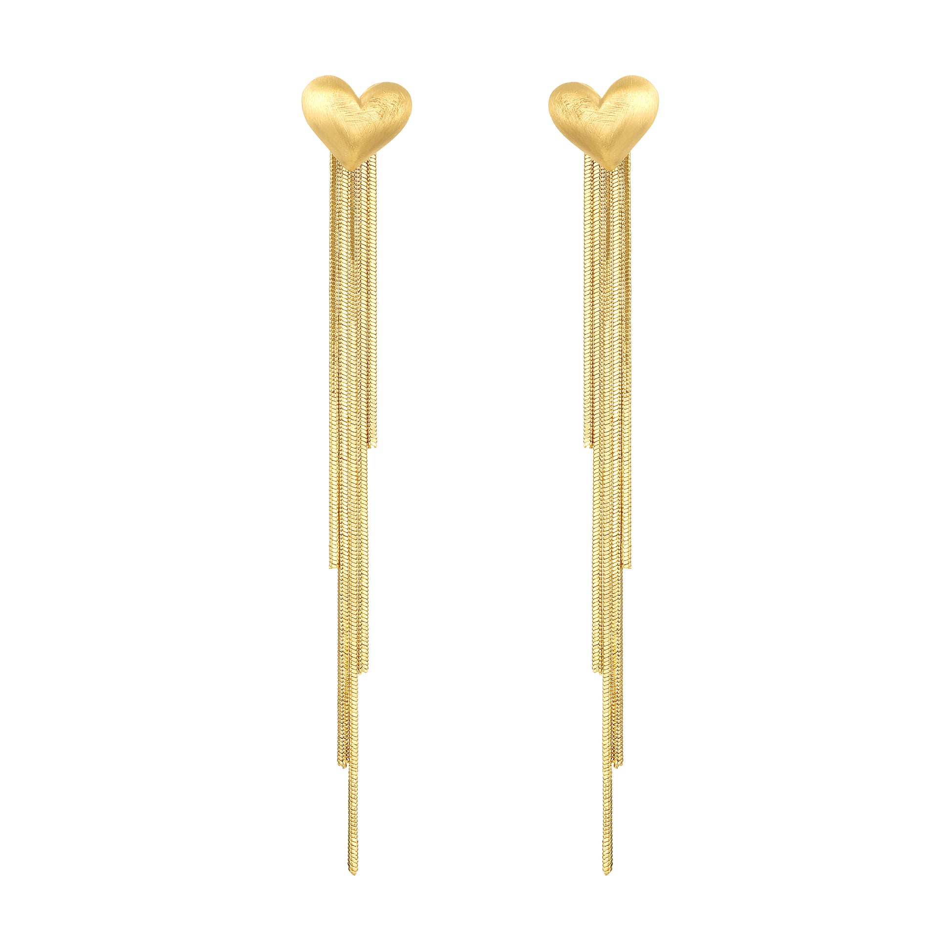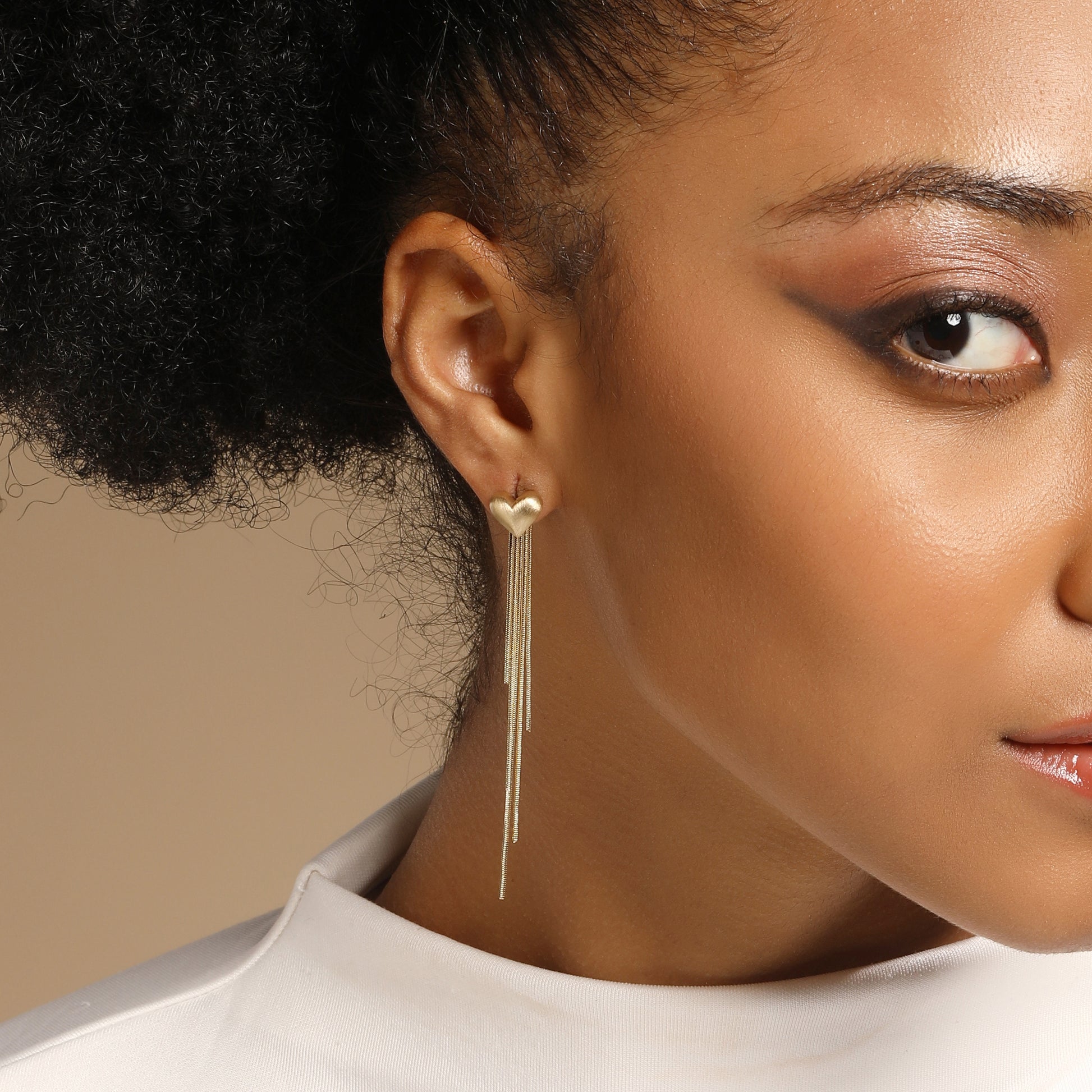 Designed to dazzle with movement, these striking earrings feature a heart-shaped top from which fine golden strands cascade like a waterfall. The elongated fringe adds drama and rhythm, giving the piece a glamorous flow that catches the light with every step.