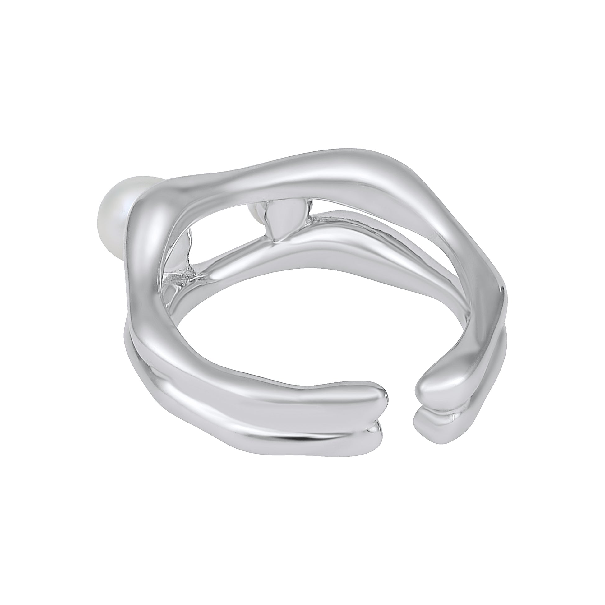 This ring features two smooth pearls set on an open silver-plated band, creating a soft, balanced look with a modern twist. The asymmetrical placement adds a touch of artistic charm, while the pearls bring in a sense of calm, grace, and timeless beauty.