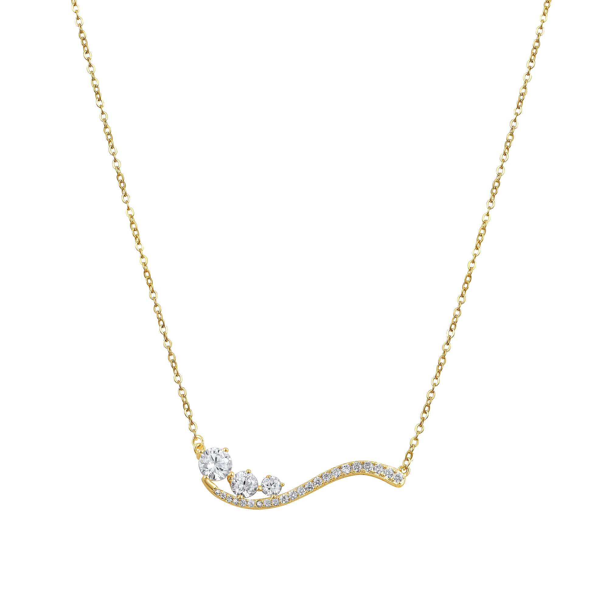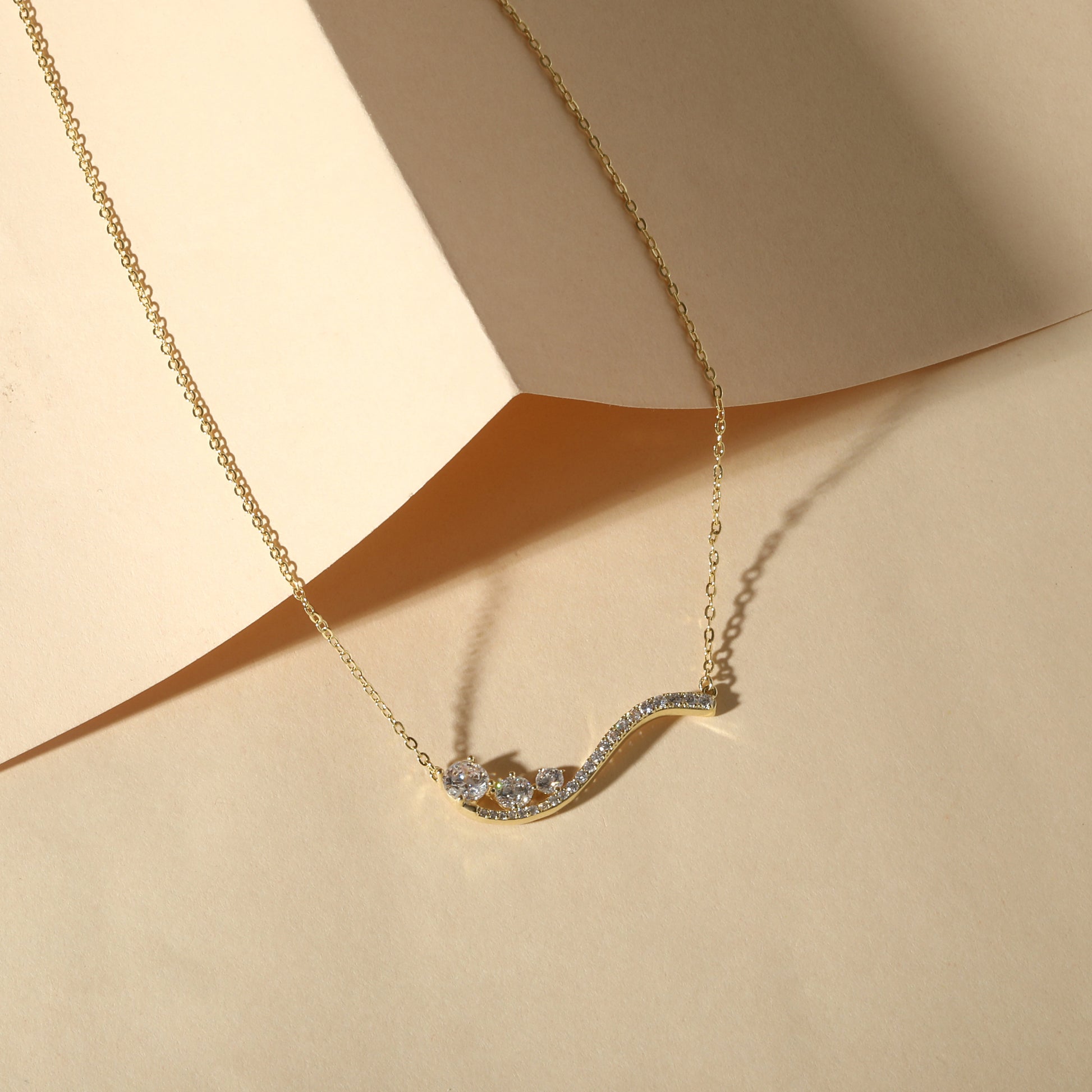 This necklace shows off a smooth, wave-like pendant set with tiny zircon stones, all resting on a neat gold-plated chain. The curved shape gives it a soft, flowing look that catches the light beautifully.