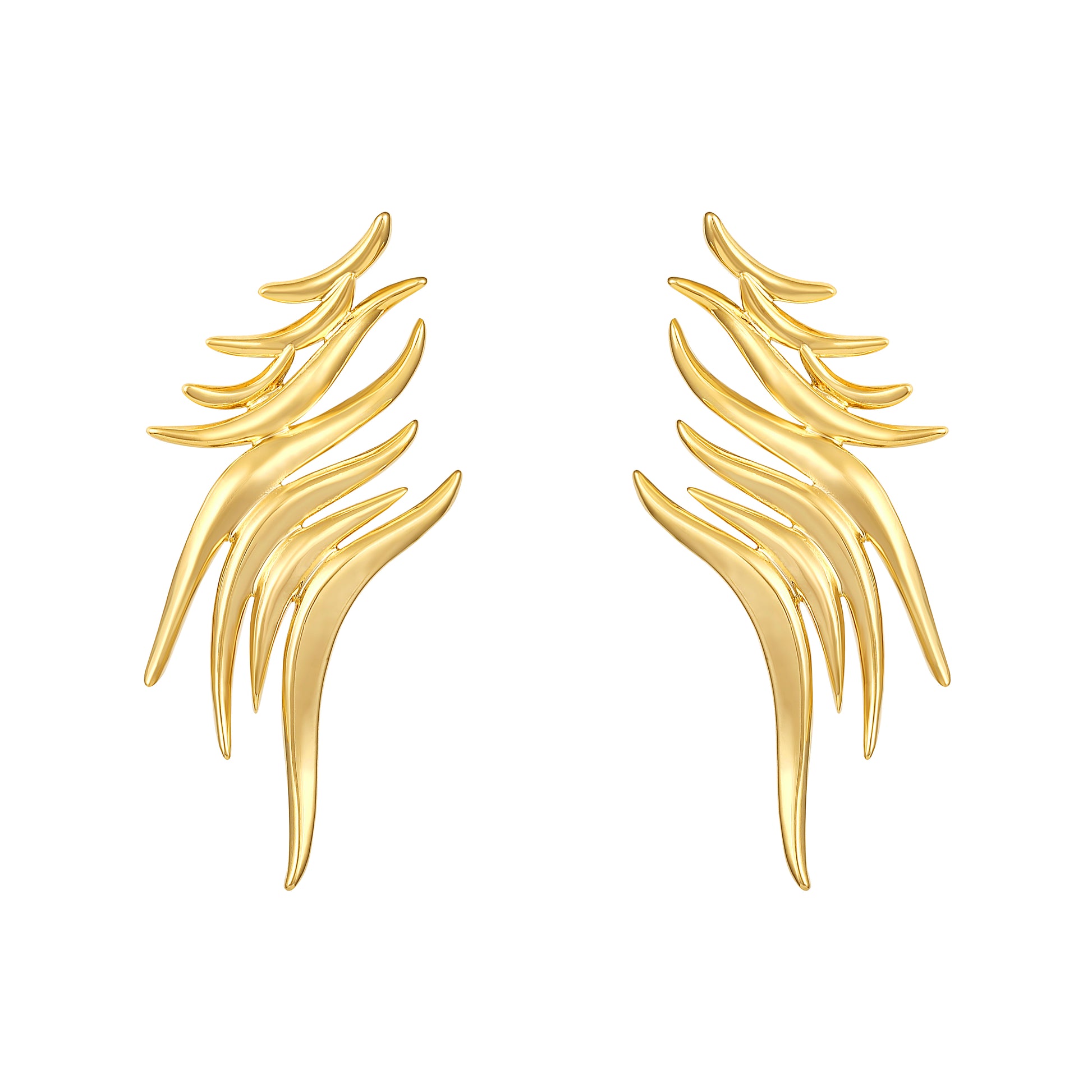 These striking earrings feature a layered leaf-like design with elongated, overlapping curves that echo the elegance of falling foliage. Sculpted in radiant 18KT gold plating, their graceful flow adds an organic touch to festive and contemporary looks alike.