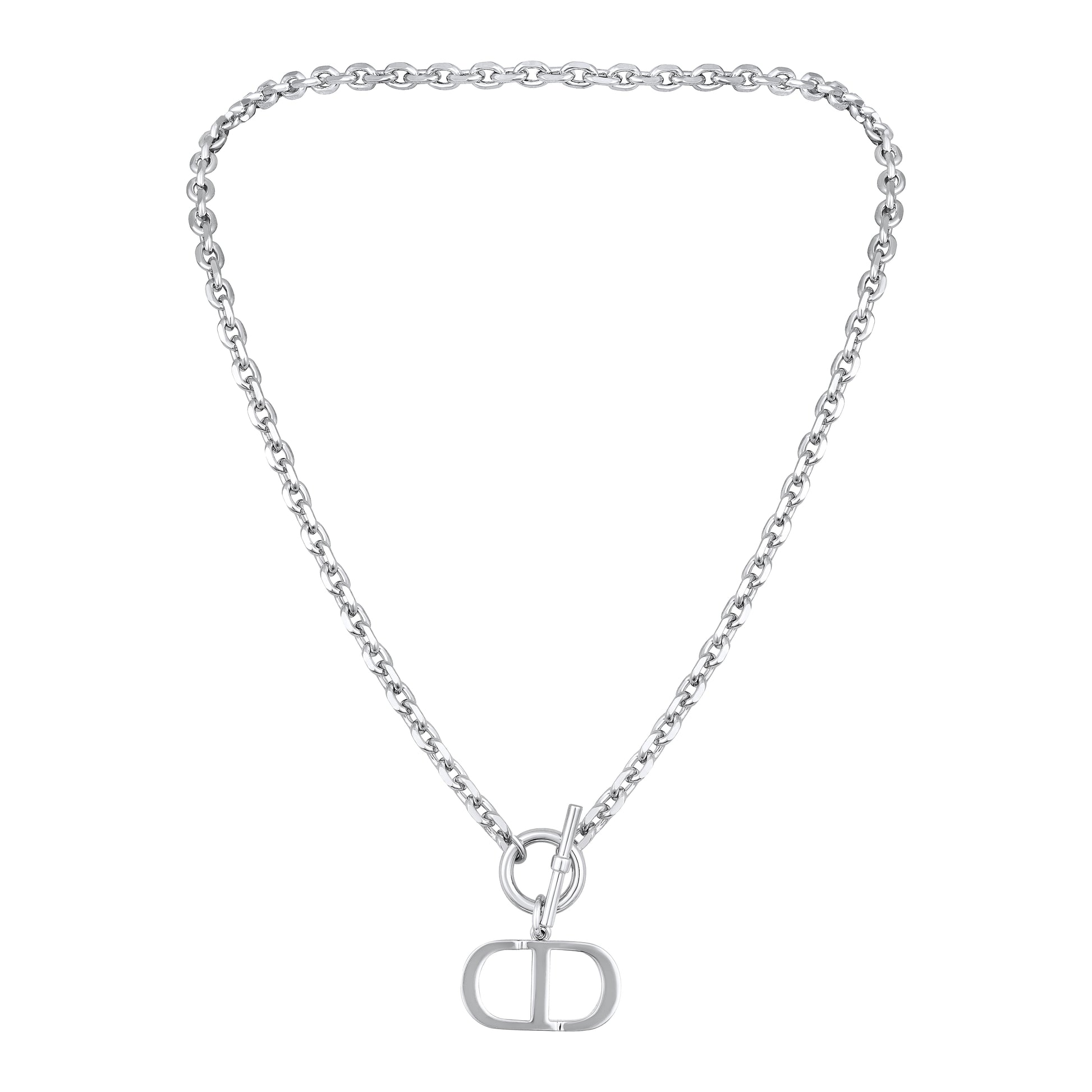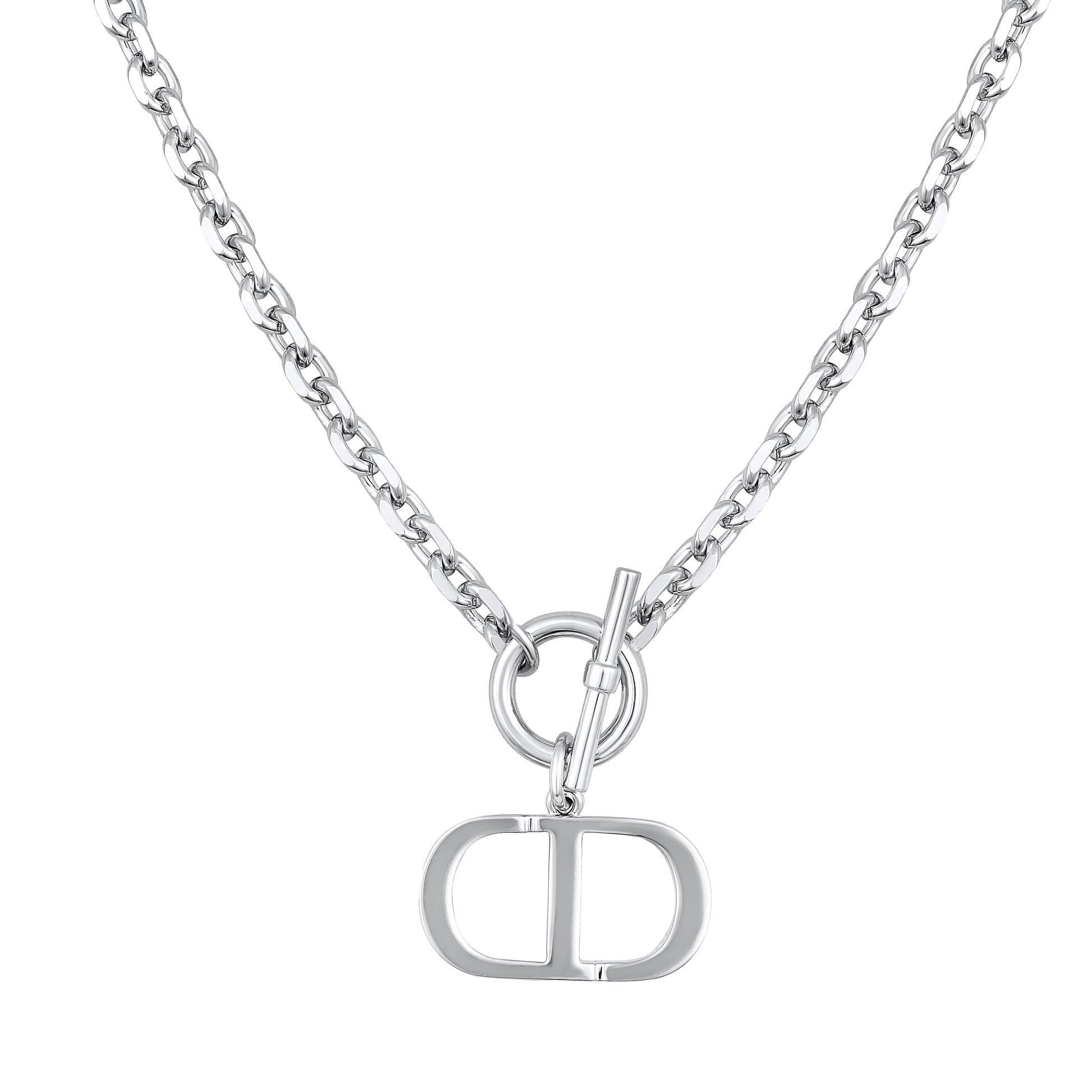 This contemporary necklace features a unique D-shaped pendant accented with a horizontal bar, suspended on a polished silver-plated chain with a toggle clasp for easy fastening. The design’s clean lines and architectural simplicity bring a bold, modern feel to your neckline.