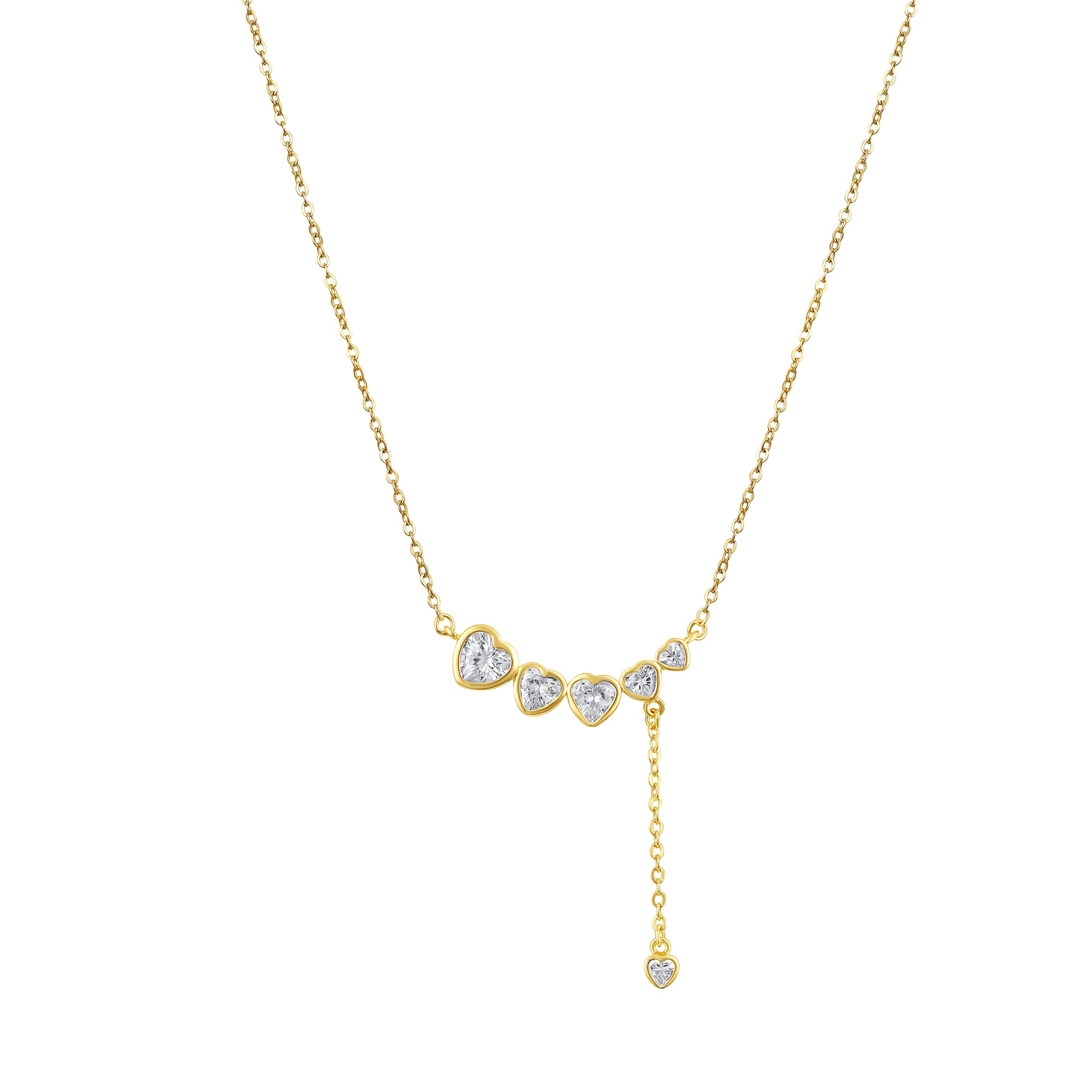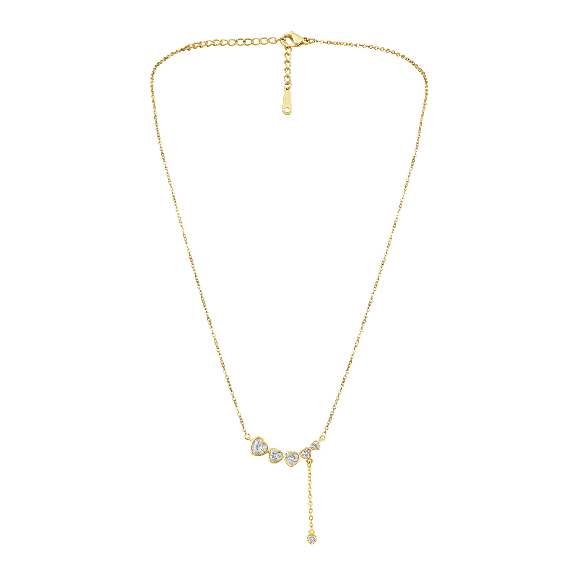 This charming necklace features a cluster of sparkling, heart-shaped pieces joined together in a clover-like shape, with one extra heart gently dangling below. Set on a fine gold-plated chain, the design adds both shine and movement, creating a graceful look that stands out.