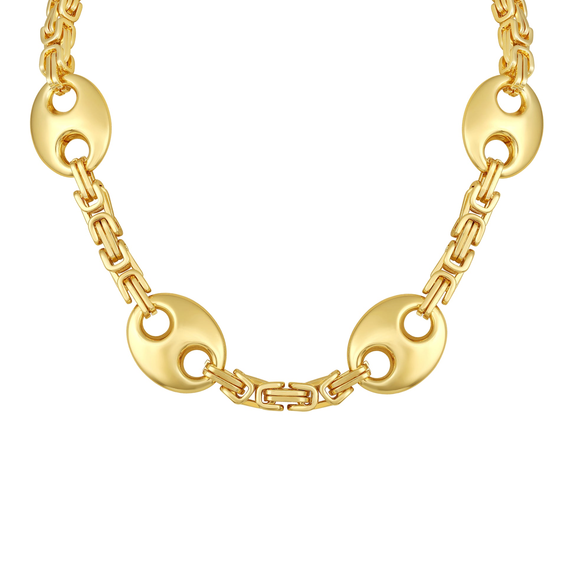 This necklace features a flowing sequence of large oval links interwoven with smaller textured connectors, all finished in radiant 18KT gold plating. The contrast between smooth and intricate detailing gives the piece a dynamic, elegant profile that stands out with subtle sophistication.