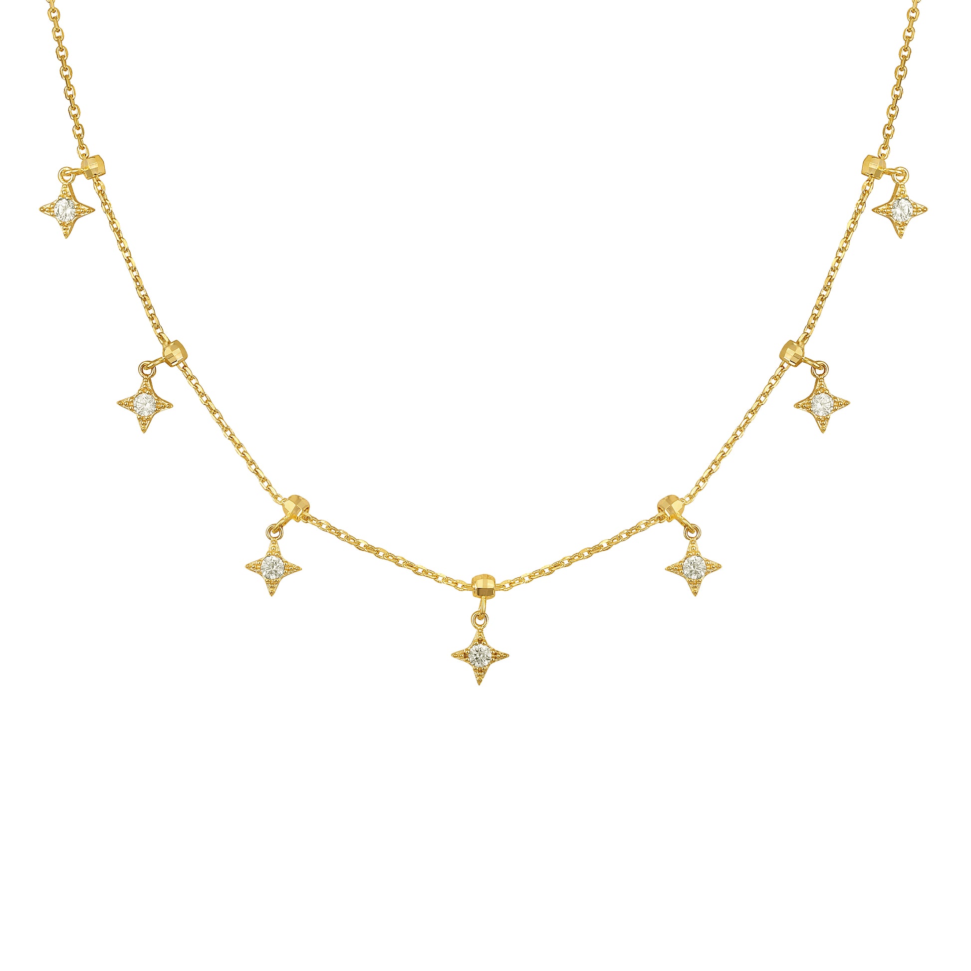 This delicate necklace features a graceful arrangement of star-shaped charms, each one polished in 18KT gold plating and evenly spaced along a fine chain. The symmetrical design evokes celestial elegance and adds a hint of sparkle to every look.