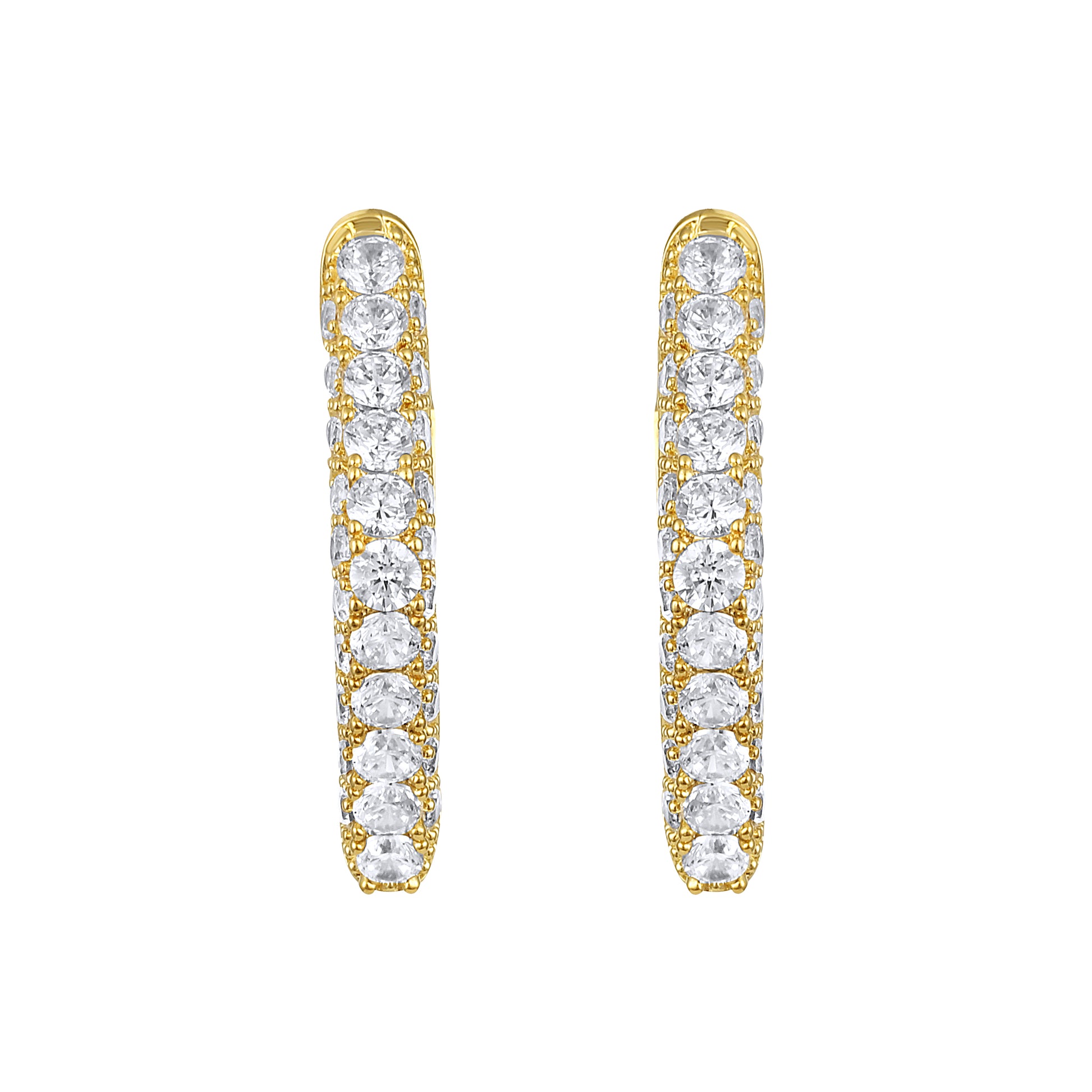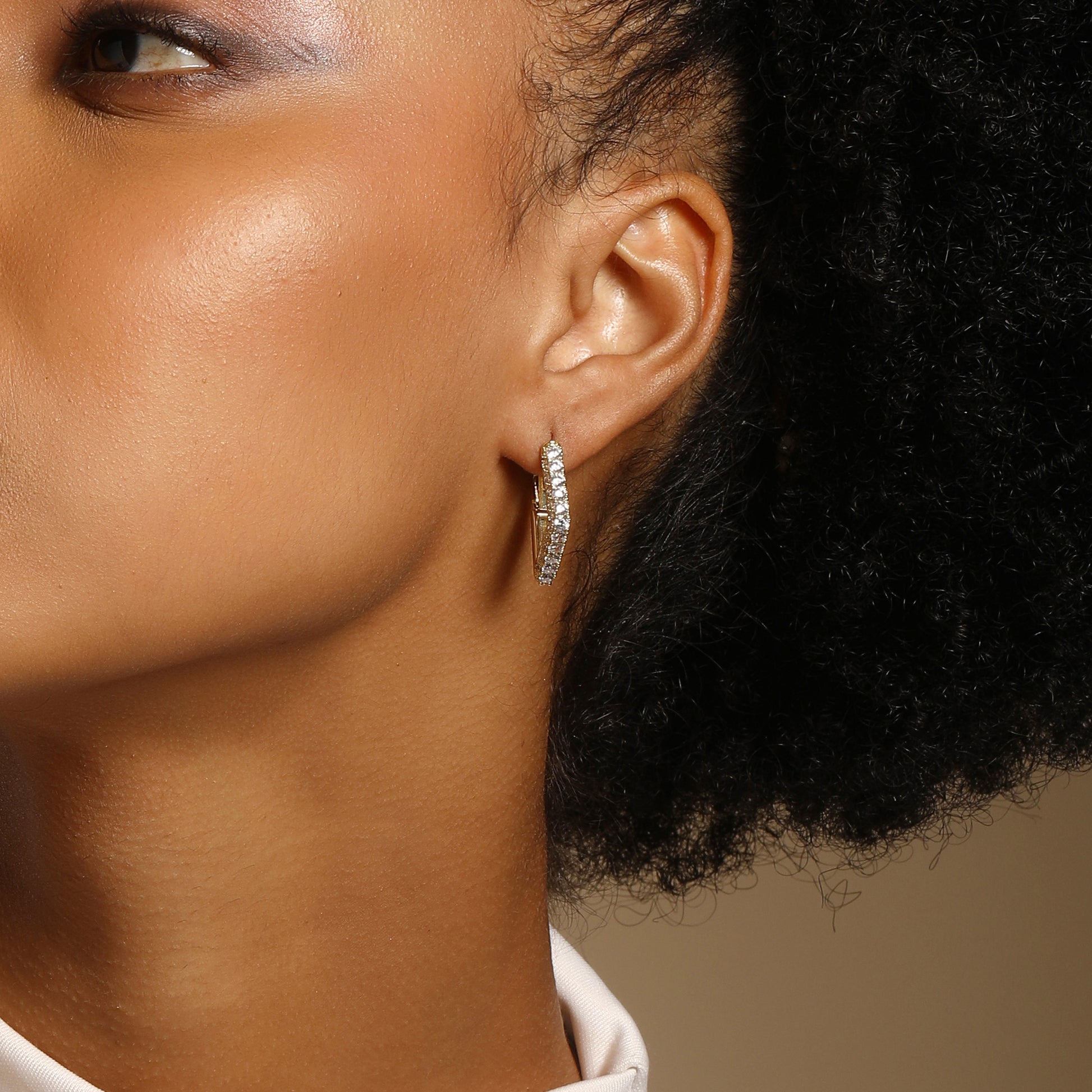 These gold hoop earrings combine crisp angular lines with shimmering diamond accents, creating a unique design that feels both modern and timeless. The front edge is lined with sparkling stones that catch the light beautifully, while the polished 18KT gold plating adds a luxe finish.
