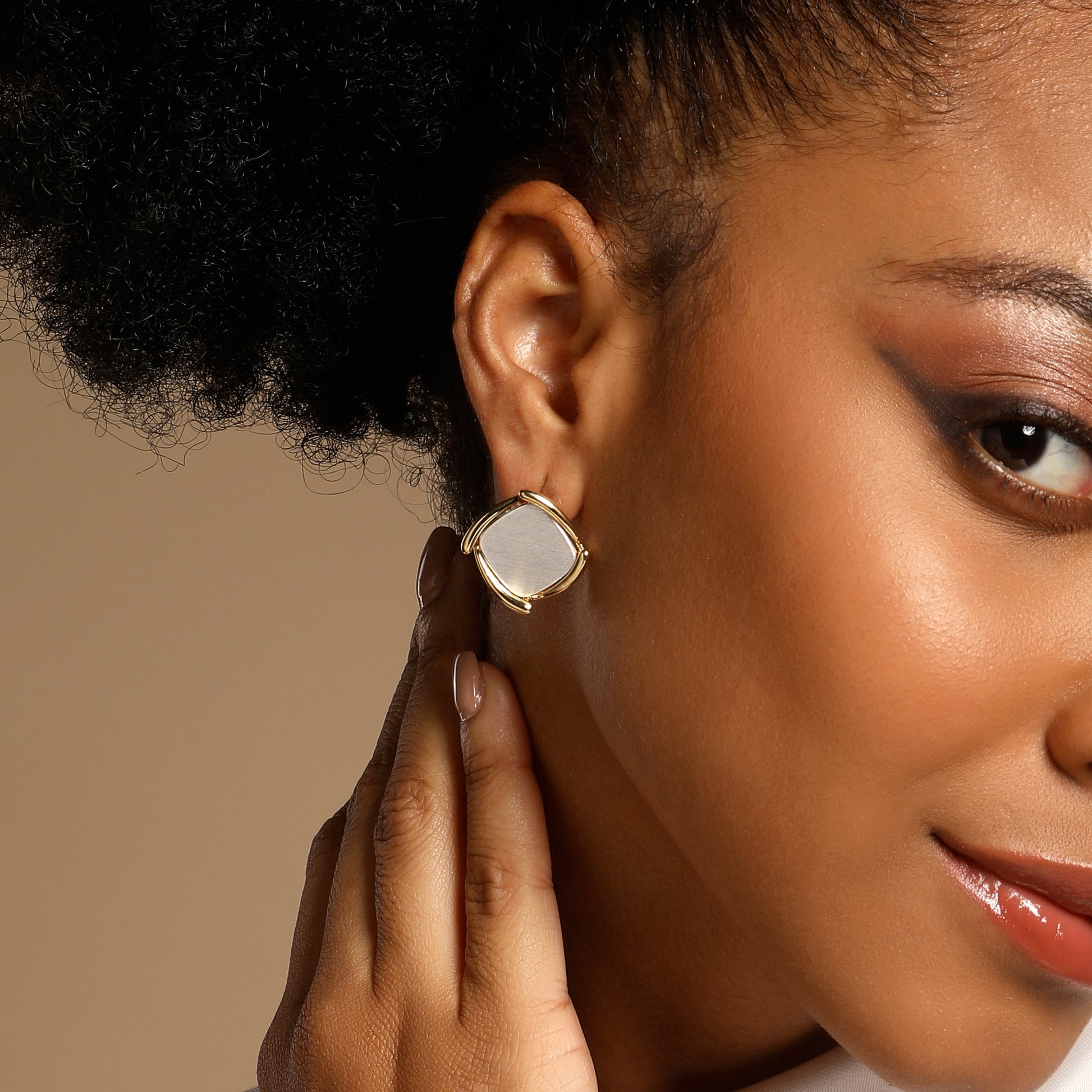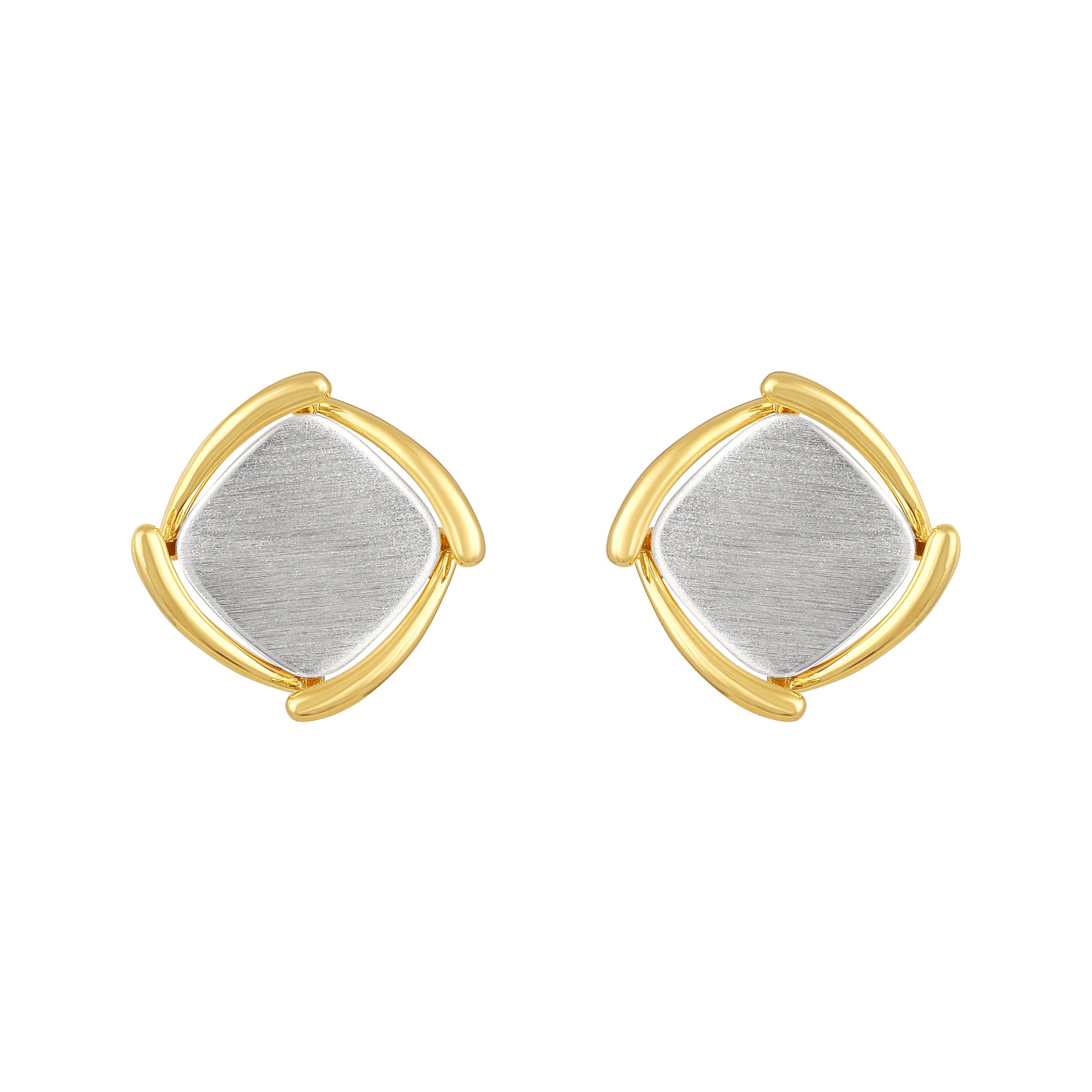 Balancing structure and shine, these square stud earrings feature a two-tone design with a soft silver-toned center framed by curved gold detailing. The contrast in color and finish adds depth and sophistication, creating a wrapped effect that catches the light from every angle.