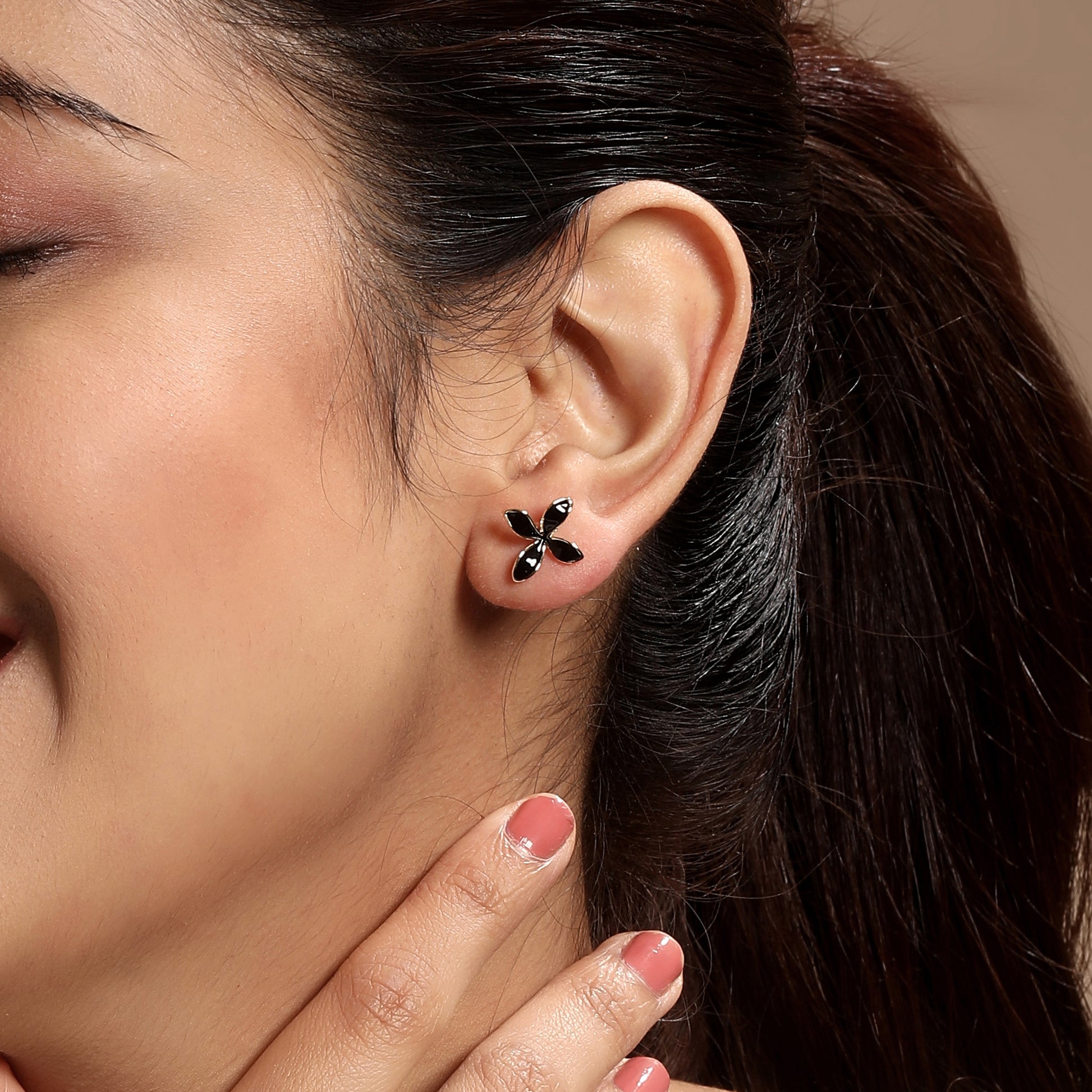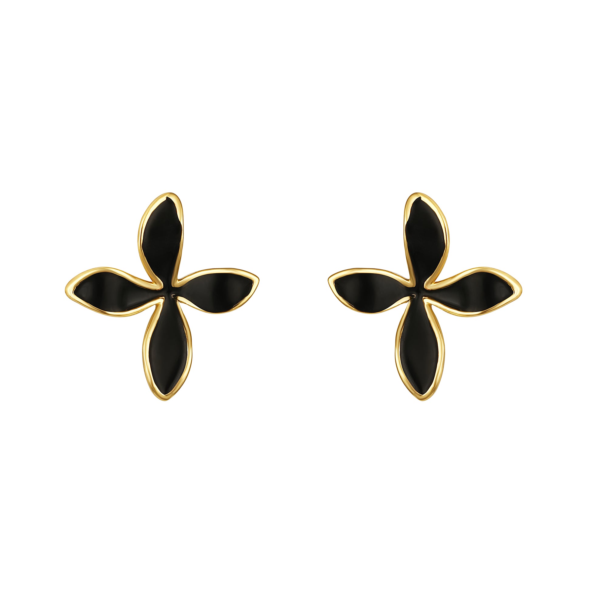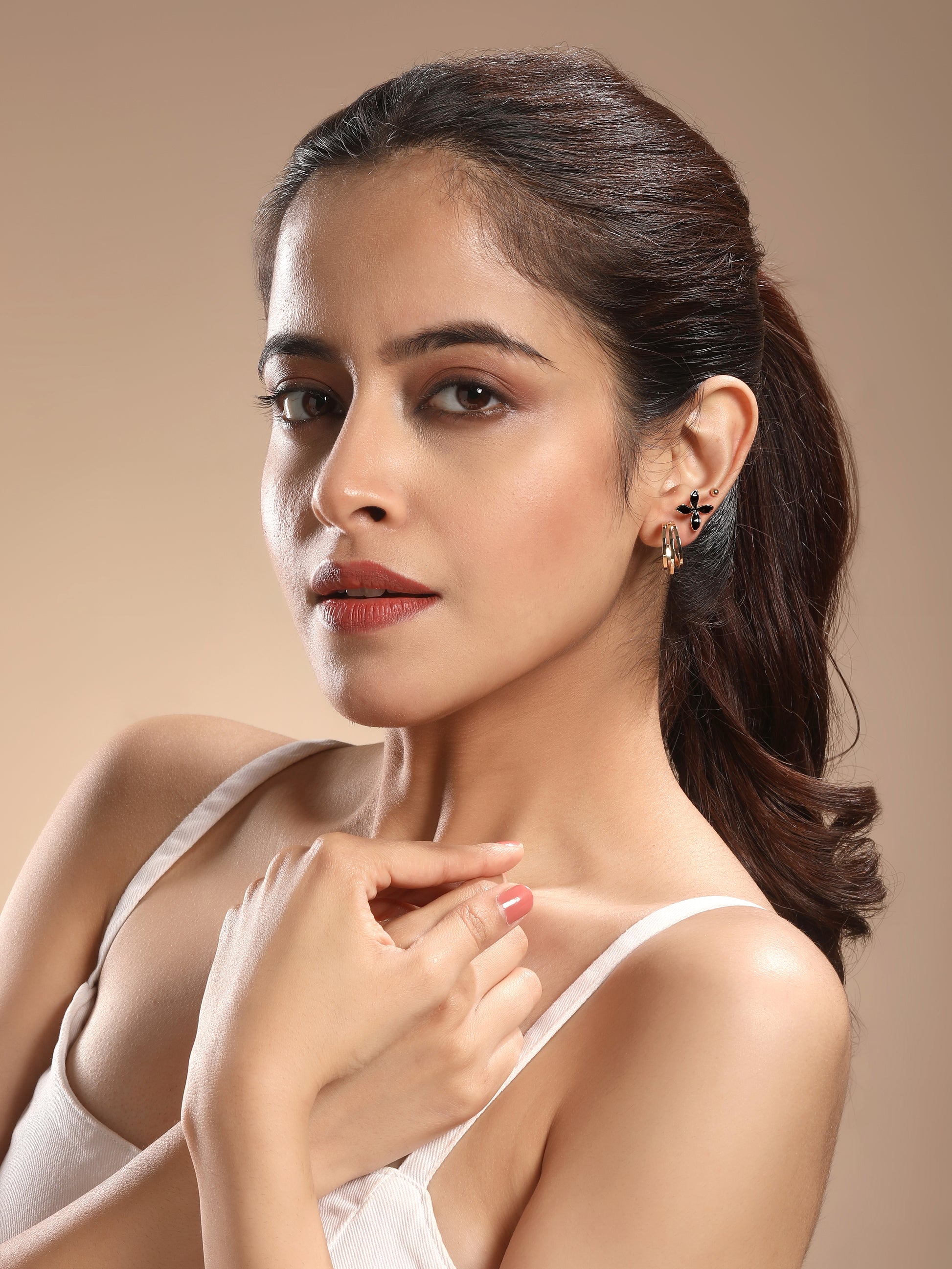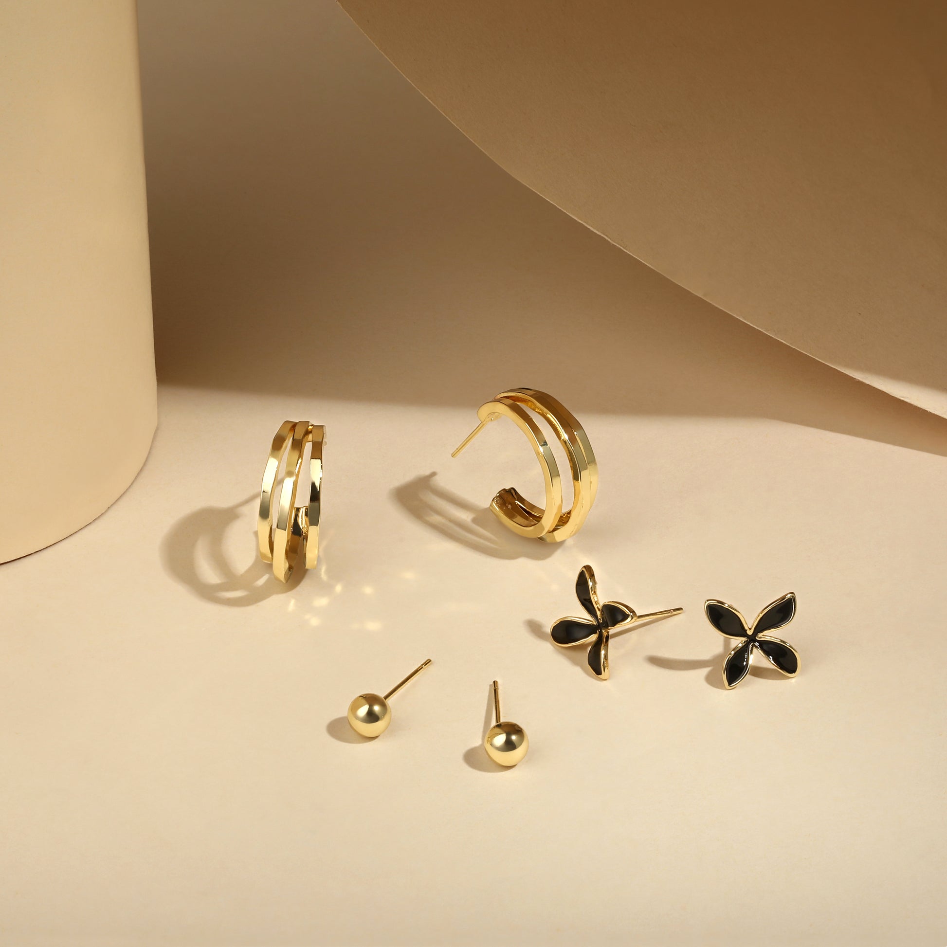 This versatile earring set features three distinct styles to elevate any occasion. It includes classic gold bead studs for everyday shine, floral studs with black petals outlined in gold for a touch of playful elegance, and sculptural gold hoops with an interwoven design that bring modern flair to your ensemble.