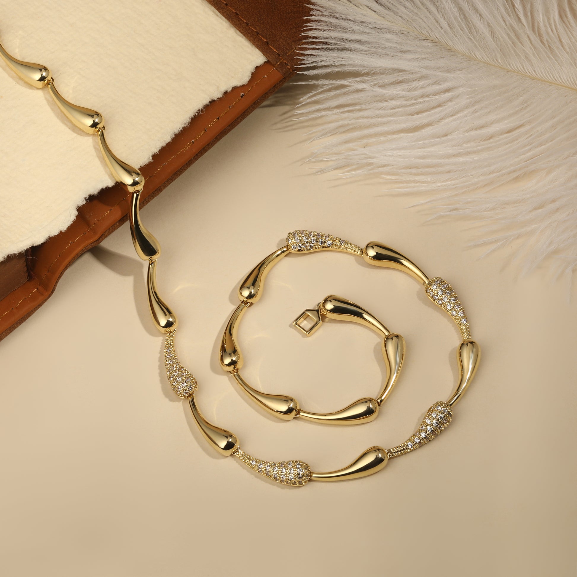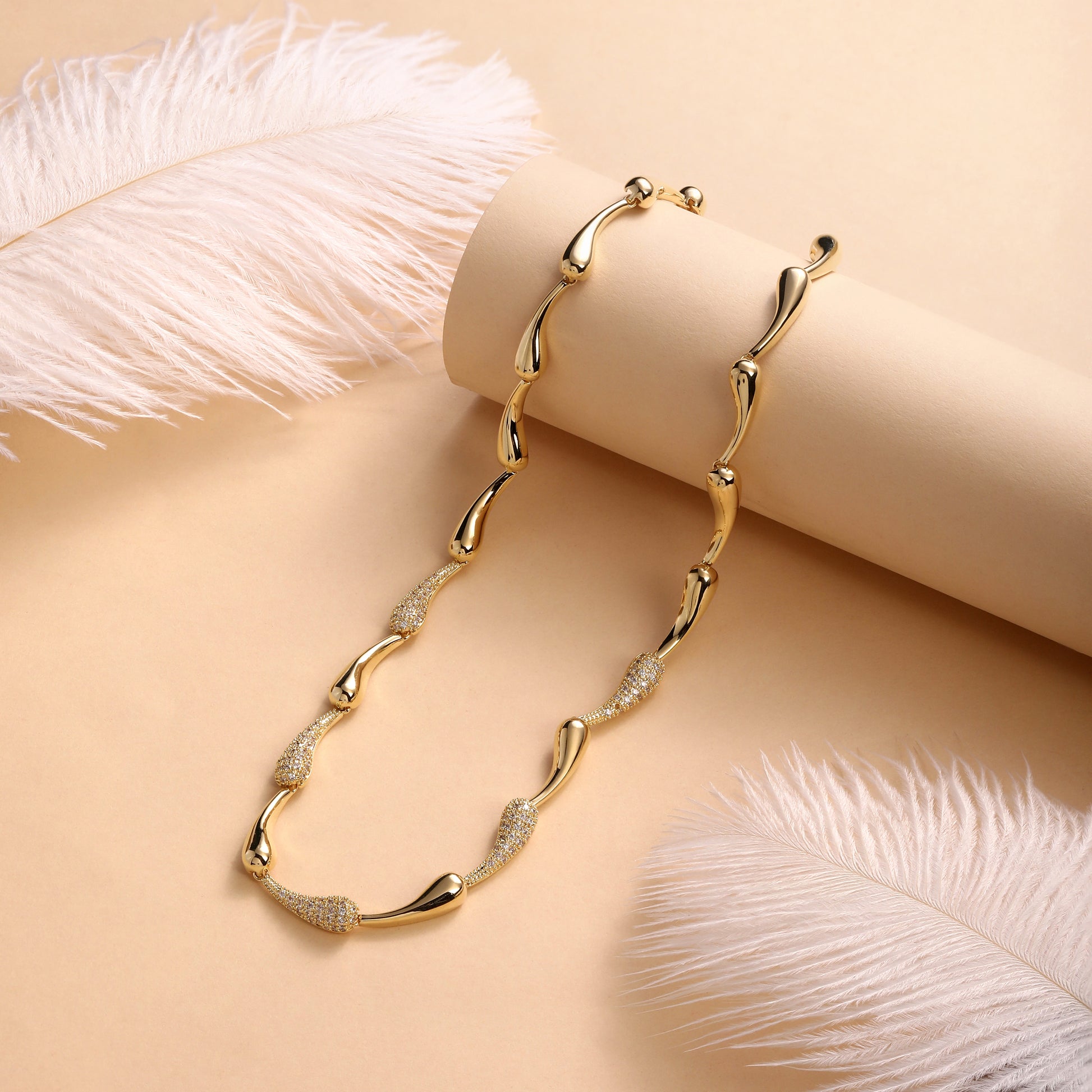 Elegant and expressive, this necklace features alternating gold-toned teardrop links and shimmering zircon-studded segments. The combination creates a refined rhythm of glow and sparkle along the neckline, finished in radiant 18KT gold plating for a lasting, luxurious shine.