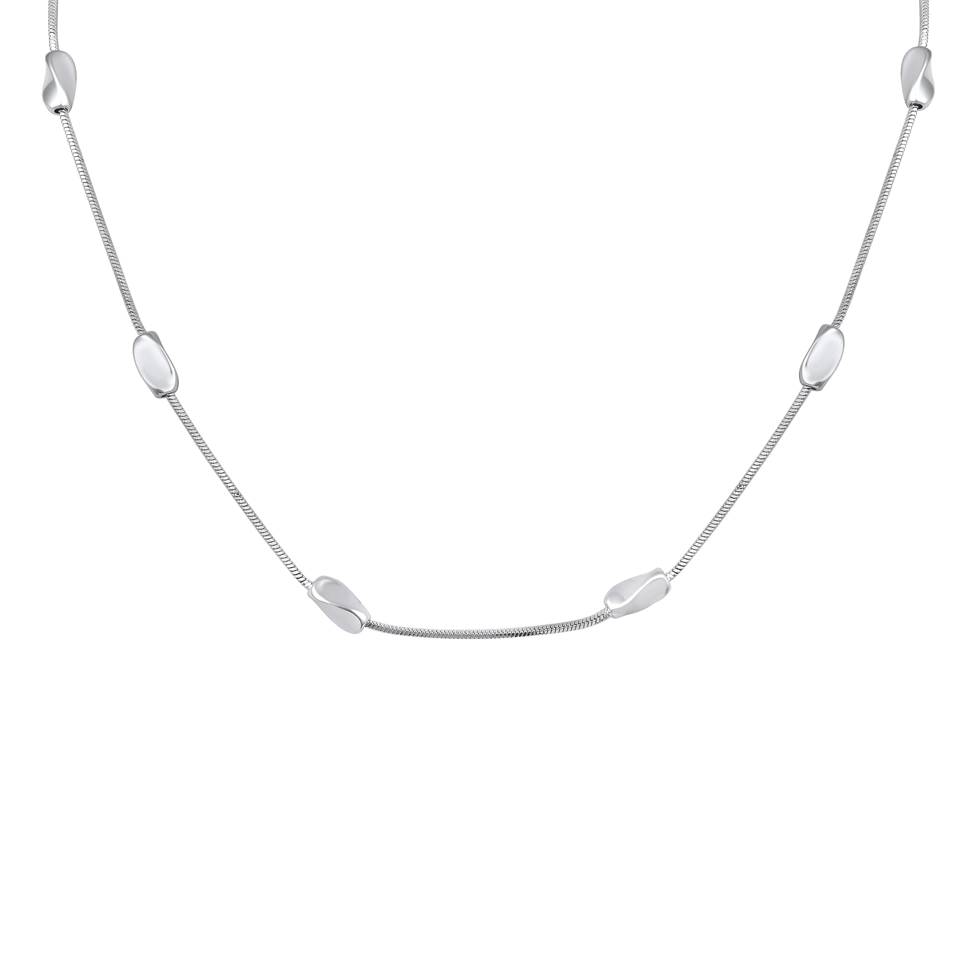 This elegant necklace features a sleek silver-plated chain adorned with evenly spaced knot-inspired beads, creating a subtle rhythm of texture and shine. The smooth, polished finish gives it a graceful shimmer, perfect for everyday wear or layered styling.
