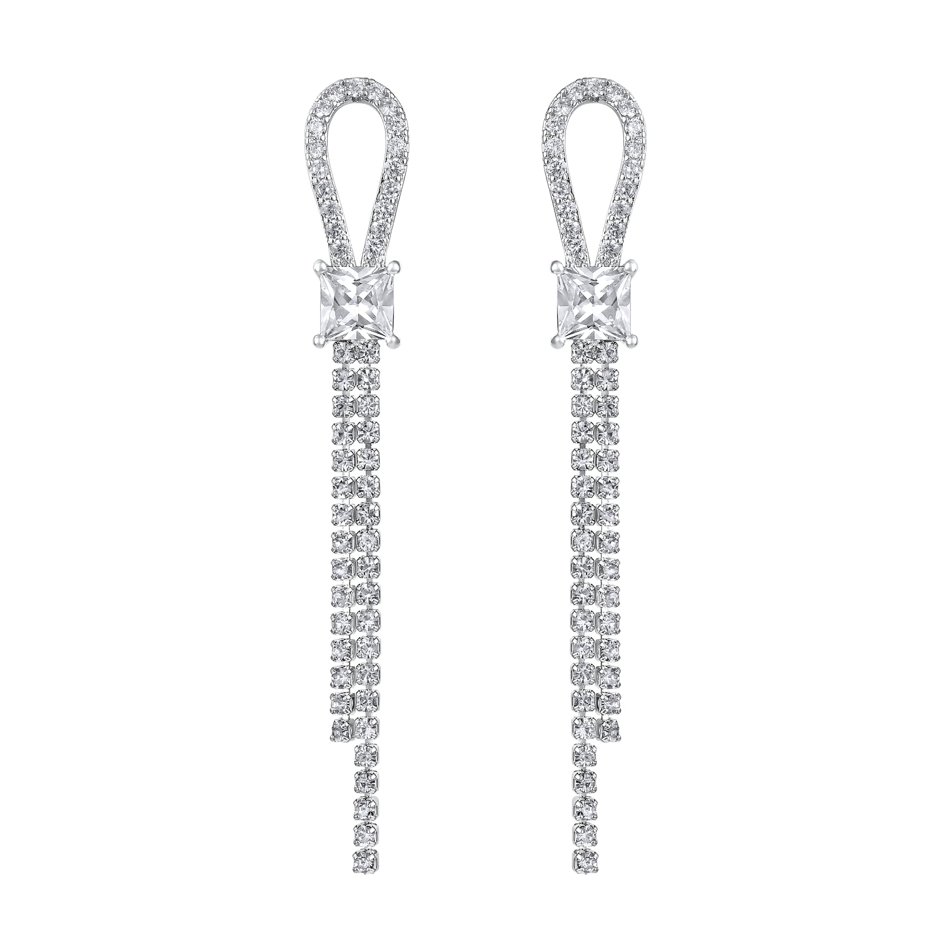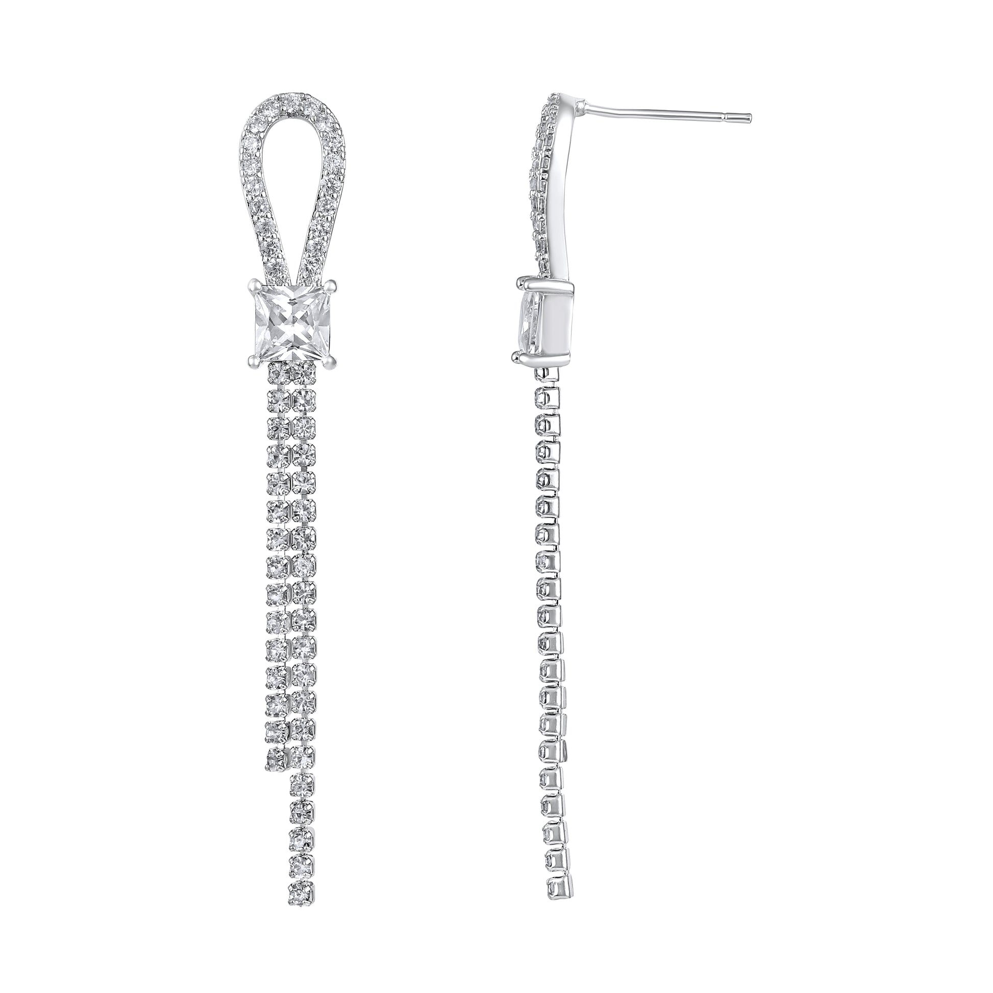 These radiant silver earrings combine graceful loops with a line of cascading stones, creating a refined sparkle from lobe to shoulder. The top half features a crystal-studded curve, while the drop ends in a dazzling vertical trail—balancing fluid design with eye-catching elegance.